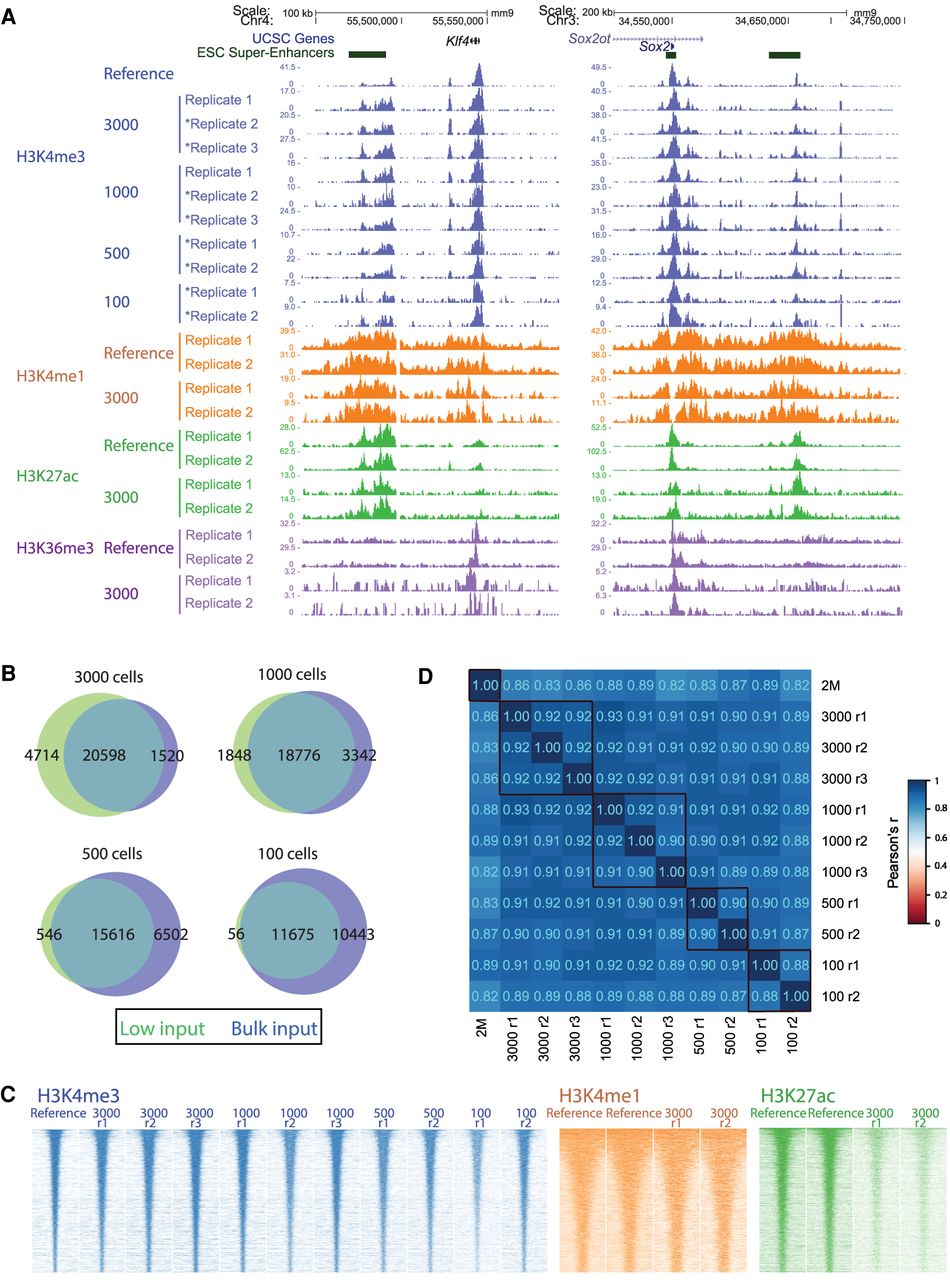PnP-ChIP-seq using small cell quantities of mESCs by the use of MNase. (A) Gene-centered genome browser view for PnP-ChIP-seq of H3K4me3, H3K4me1, H3K27ac, and H3K36me3. Profiles labeled with an asterisk were generated from a starting amount of 7500 mESCs; otherwise, 15,000 mESCs were used. (B) Overlap between de novo peak calls of PnP-ChIP-seq and bulk ChIP-seq. (C) Heatmap of merged peak set for various starting amount of sonicated chromatin for PnP-ChIP-seq of H3K4me3, H3K4me1, H3K27ac, and H3K36me3. (D) Cross-correlations of H3K4me3 PnP-ChIP-seq using tag counts of merged peak set.