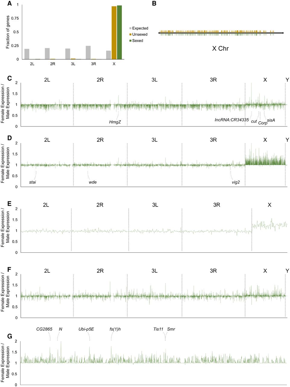 Analyses of sex differences in the early germline. (A) Chromosomal distribution of genes from the female-enriched expression modules. The fraction of genes belonging to each chromosome is plotted. Gray bars, expected distribution based on number of genes on each chromosome; yellow bars, distribution of genes from the unsexed sample; green bars, distribution of genes from the sexed sample. (B) Distribution of X Chromosome genes from female-enriched expression modules along the X Chromosome. The yellow and green marks designated genes from the unsexed and sexed data sets, respectively. (C) Differences in expression levels of all genes between female and male germ cells prior to the bifurcation point of the germline cluster from the adjusted sexed data set in which male reads were reduced randomly by 25%. The x- and y-axes are the same for C–F: the x-axes plot the positions on individual chromosomes as indicated and the y-axes plot the fold differences of expression of female germ cells over male germ cells. The identities of the most female-biased genes are indicated. (D) Differences in expression levels of all genes between female and male germ cells after they bifurcate in the germline cluster from the adjusted sexed data set. The gene names of the most male-biased peaks are indicated. (E) Expression differences of the 647 zygotically activated germline genes between the two sexes based on the adjusted sexed data set. (F) Female-to-male expression ratio of all genes of somatic cells included in the adjusted sexed sample. (G) Female-to-male expression ratios of X Chromosome genes of germ cells after bifurcation from the adjusted sexed data set. The identities of the highest peaks are indicated.