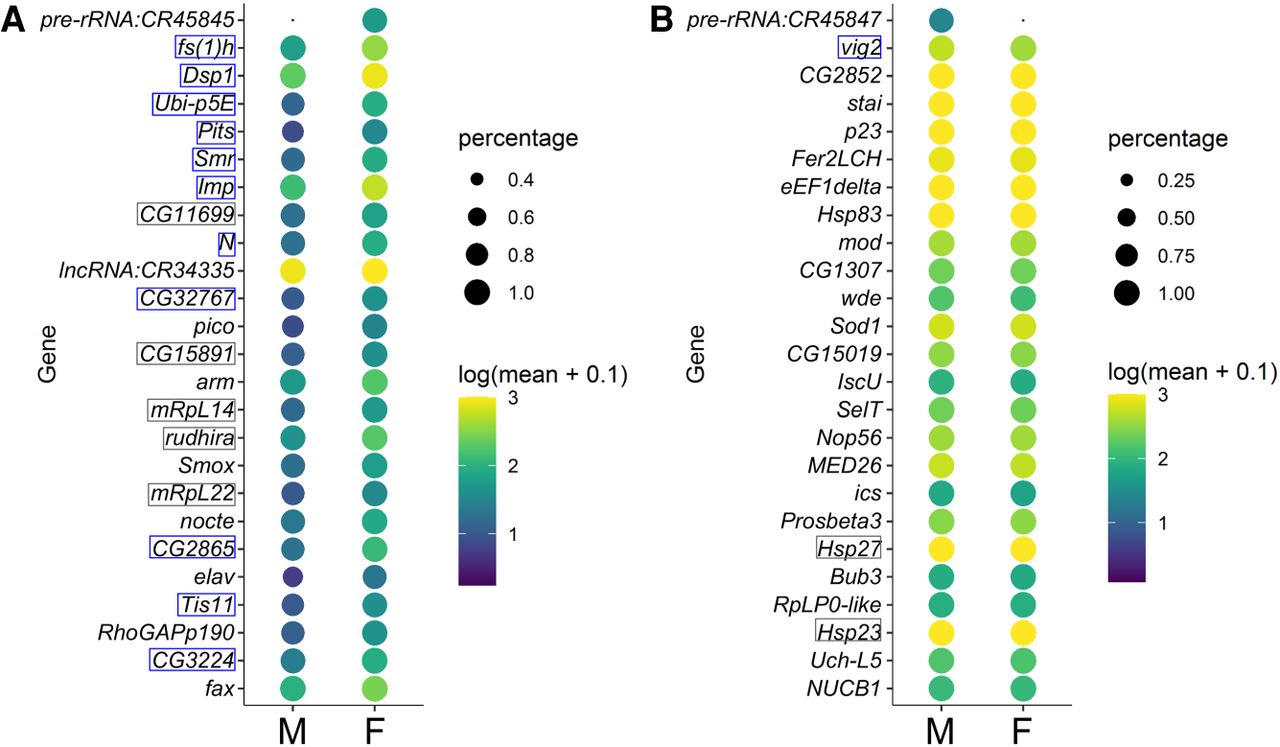 Top sex markers from the sexed data set. (A) Expression profiles of the top 25 female markers in the male and female germline clusters after zygotic activation are plotted, with the colors reflecting mean expression as indicated on the right; the size of the dots reflects the fraction of cells in the clusters with detectable expression of each gene. The gene names boxed in gray or blue are those also determined as top female markers in the unsexed data set (Supplemental Fig. S9); the ones predicted to be transcription- or chromatin-associated factors are marked with blue boxes. (B) Expression patterns of the top 25 male markers plotted in the same way as in A.