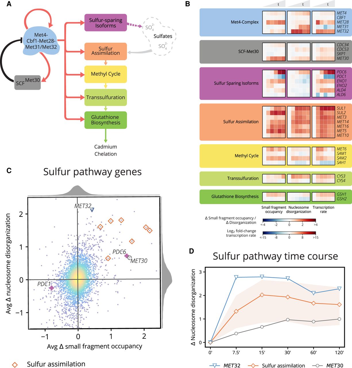 Chromatin and transcription dynamics detail Met4 and Met32 functional activation, induction of sulfur genes, and subsequent regulation. (A) The Met4 complex activates cascading sulfur pathways required for cadmium chelation and also activates its negative regulator SCFMet30. (B) Heat map of changes in chromatin occupancy and transcription rate for the sulfur pathway genes. Cofactors of the Met4 complex exhibit chromatin changes in small fragment occupancy (for MET28) and nucleosome disorganization (for MET32). Sulfur sparing isoforms occur as isoenzyme pairs; members of each pair exhibit inverse chromatin dynamics (most pronounced between PDC6 and PDC1). Nearly all of the sulfur assimilation pathway members show an increase in small fragment occupancy and nucleosome disorganization. (C) Scatterplot of average change in small fragment occupancy and average change in nucleosome disorganization. Chromatin dynamics in sulfur-related genes may manifest primarily in a single measure of the chromatin, as with MET32 (blue triangle), MET30 (gray circle), and PDC6/PDC1 (violet crosses), or in both small fragment occupancy and nucleosome disorganization, such as with the sulfur assimilation genes (orange diamonds). (D) Line plot of the change in nucleosome disorganization for the activator gene MET32, regulator gene MET30, and sulfur assimilation genes (orange line represents mean and light orange region represents full range of values across all seven genes). Nucleosome disorganization for Met4 complex cofactor MET32 peaks at 7.5 min whereas targets of the Met4 complex peak later: sulfur assimilation genes within 15–30 min and the negative regulator MET30 more gradually.