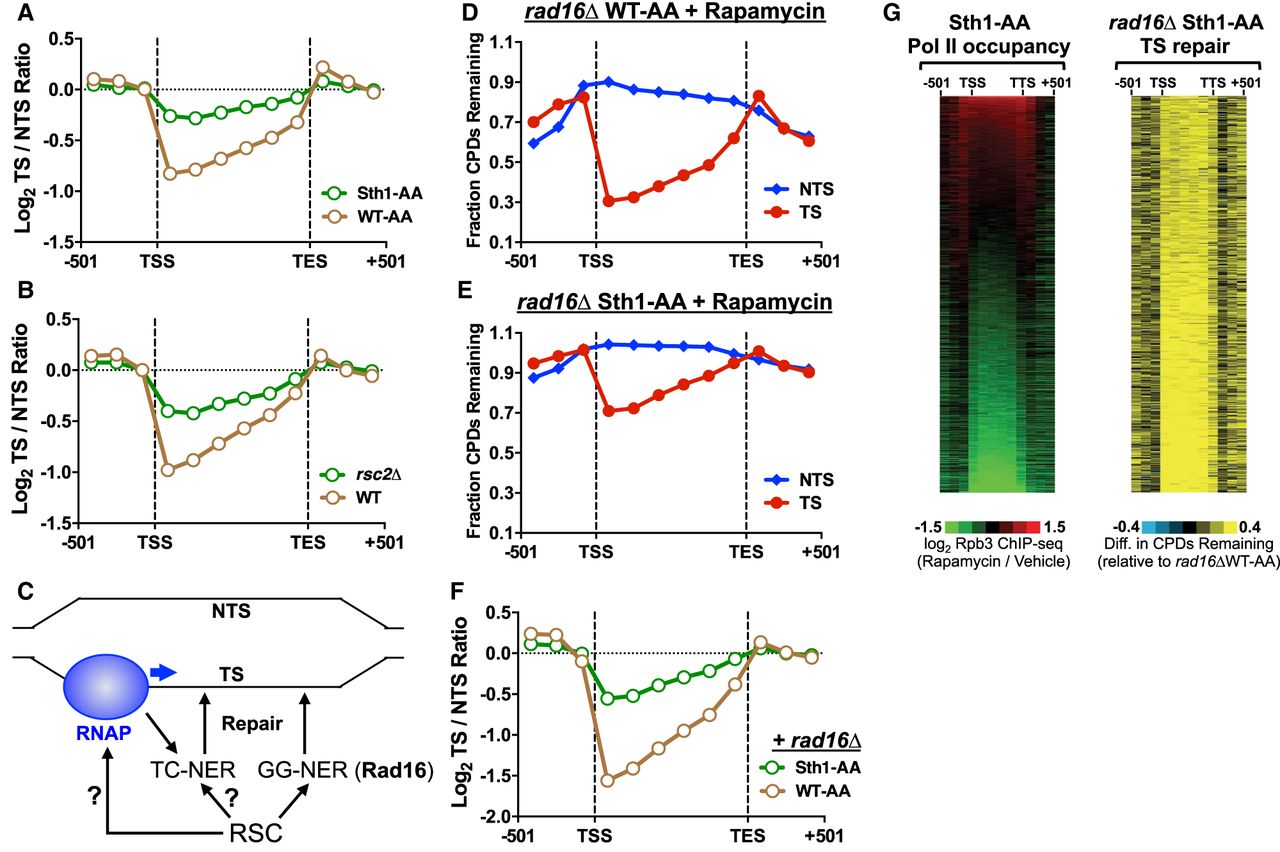 RSC plays a direct role in transcription-coupled NER. (A) TC-NER efficiency is reduced in Sth1-AA cells relative to the WT-AA control, as reflected by the log ratio of unrepaired CPDs on the TS relative to the NTS being closer to zero (i.e., no repair asymmetry owing to TC-NER). CPD-seq data are for the 2-h repair time point relative to the 0-h control for approximately 5000 genes. (B) Same as panel A, except for rsc2Δ-mutant cells. (C) Schematic of RSC's potential roles in TC-NER. It is possible RSC may promote repair of the TS through GG-NER or may affect TC-NER indirectly (by altering RNA polymerase II [RNAP] transcription) or directly. (D,E) CPD-seq analysis examining the repair of CPDs on both DNA strands across approximately 5000 genes of the genome in GG-NER-deficient rad16Δ WT-AA and rad16Δ Sth1-AA cells treated with rapamycin. The fraction of CPDs remaining is calculated as the ratio of damage after 2 h of repair compared with the damage immediately following UV irradiation (0 h). (F) Same as panel A, except for GG-NER-deficient rad16Δ WT-AA and rad16Δ Sth1-AA cells. (G) Gene plot analysis of RNA polymerase II (Pol II) occupancy in Sth1-AA cells (left panel). Values calculated from log ratio of Rpb3 ChIP-seq data from Sth1-AA cells treated with rapamycin relative to the vehicle control (Kubik et al. 2018). Gene plot analysis of CPD repair on the TS of rad16Δ Sth1-AA cells. Left and right display relationship between RNA Pol II occupancy and unrepaired CPDs in each of the approximately 5000 genes mapped, ordered by decreasing Pol II occupancy in Sth1-AA-depleted cells.
