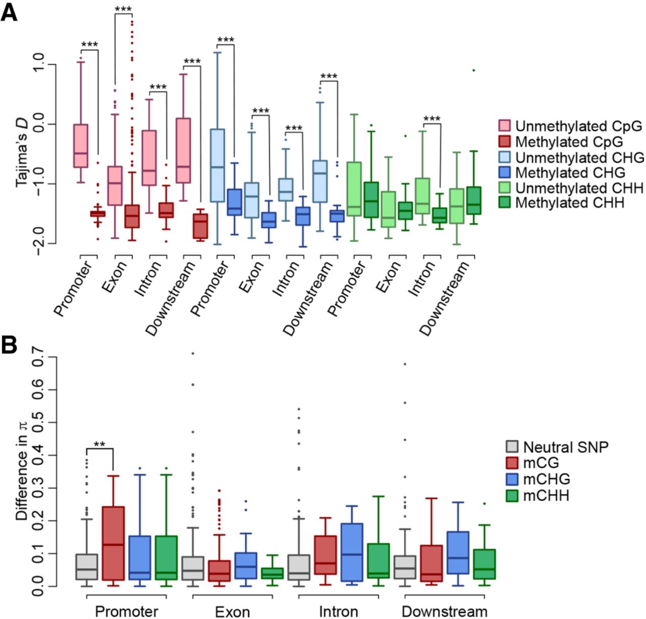 Selective sweep of DNA methylation associated with mQTG expression. (A) Tajima's D values near SMPs associated with mQTG expression. The x-axis represents SMP or SNP locations, and the y-axis represents Tajima's D values. The boxes represent Tajima's D values of accessions with no DNA methylation or accessions with DNA methylation at SMP sites associated with mQTGs having high CVs (top 1%). (B) The differences in nucleotide diversity (π) near SMPs associated with mQTG expression. The x-axis represents the SMP or SNP locations, whereas the y-axis represents the differences in π. Gray boxes represent the π differences of neutral SNPs. The other boxes represent the π differences of each type of SMP associated with mQTGs having high CVs (top 1%). The differences between the neutral SMPs and the SNPs associated with mQTGs were analyzed at each location using a Wilcoxon rank-sum test. In each box plot, the box represents the 25%–75% range, the middle line represents the median, the dotted line represents the 1%–99% range, and the outer circles represent outliers. The differences between the two groups were determined at each location using a Wilcoxon rank-sum test; (***) P < 0.001, (**) P < 0.01.