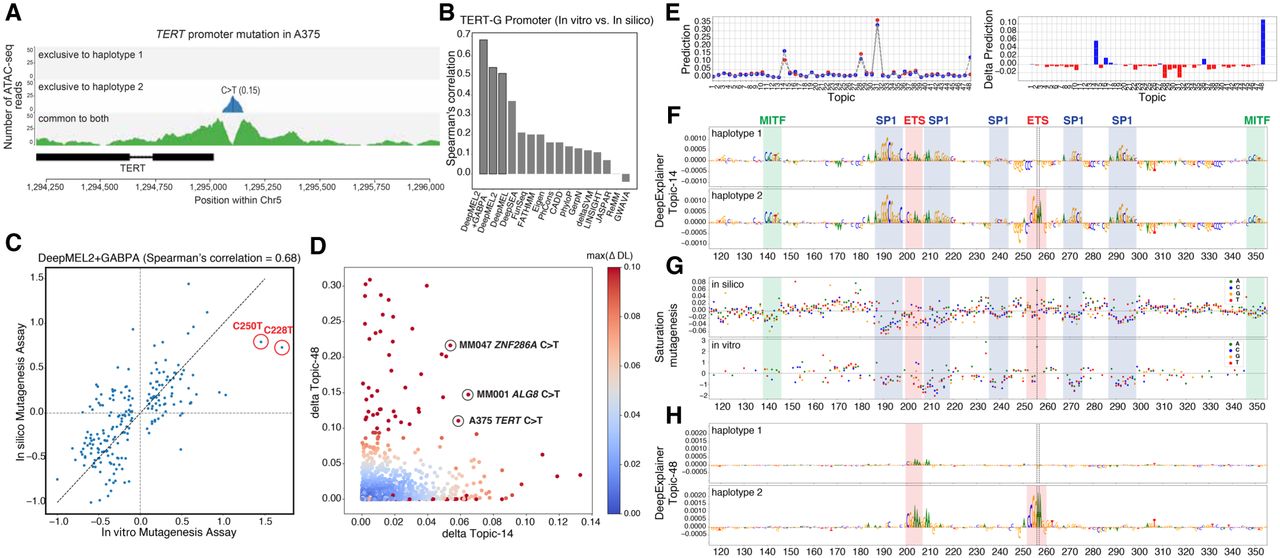 Analysis of TERT promoter mutations. (A) TERT promoter hotspot mutation in A375 is detected as an ASCAV as evidenced by ATAC-seq reads segregated into haplotypes (color-coded). In A375, haplotype 2 harbors the mutant allele T (according to WGS data) (see Supplemental Fig. S16), and ATAC-seq evidences exclusive accessibility for this allele. The corrected reference ATAC-seq allele ratio is indicated in parentheses. (B) Bar chart of model variant effect prediction performance on TERT promoter activity assessed by experimental saturation mutagenesis. (C) Scatter plot showing the effect of each variant in the in vitro (x-axis) and in silico (y-axis) mutagenesis of the TERT promoter. The two hotspot gain-of-function mutations are highlighted. (D) Scatter plot of delta Topic-14 score (promoter topic) versus delta Topic-48 score (GABPA topic) of all ASCAVs from 10 MM lines calculated by using the DeepMEL2 + GABPA model. ASCAVs are colored by their maximum delta prediction score. The TERT mutation of A375, as well as two newly predicted GABPA gains in MM047 and MM001 that are discussed in the text, are encircled. (E) The DeepMEL2 prediction score for each topic for both the haplotype 1 (red) and haplotype 2 (blue) of the A375 TERT locus is shown on the left, and the delta prediction scores between two haplotypes are shown on the right. The delta prediction scores for both Topic-14 (promoter topic) and Topic-48 (GABPA topic) are above the 0.05 detection threshold. (F,H) Haplotype-specific DeepExplainer plots of the A375 TERT promoter locus by using Topic-14 (F) and Topic-48 (H), annotated with the corresponding TFs. (G) Comparison of in silico (top; DeepMEL2 delta Topic-14 prediction scores) and in vitro (bottom; fold change in promoter activity) saturation mutagenesis assay. Each variant is color-coded.