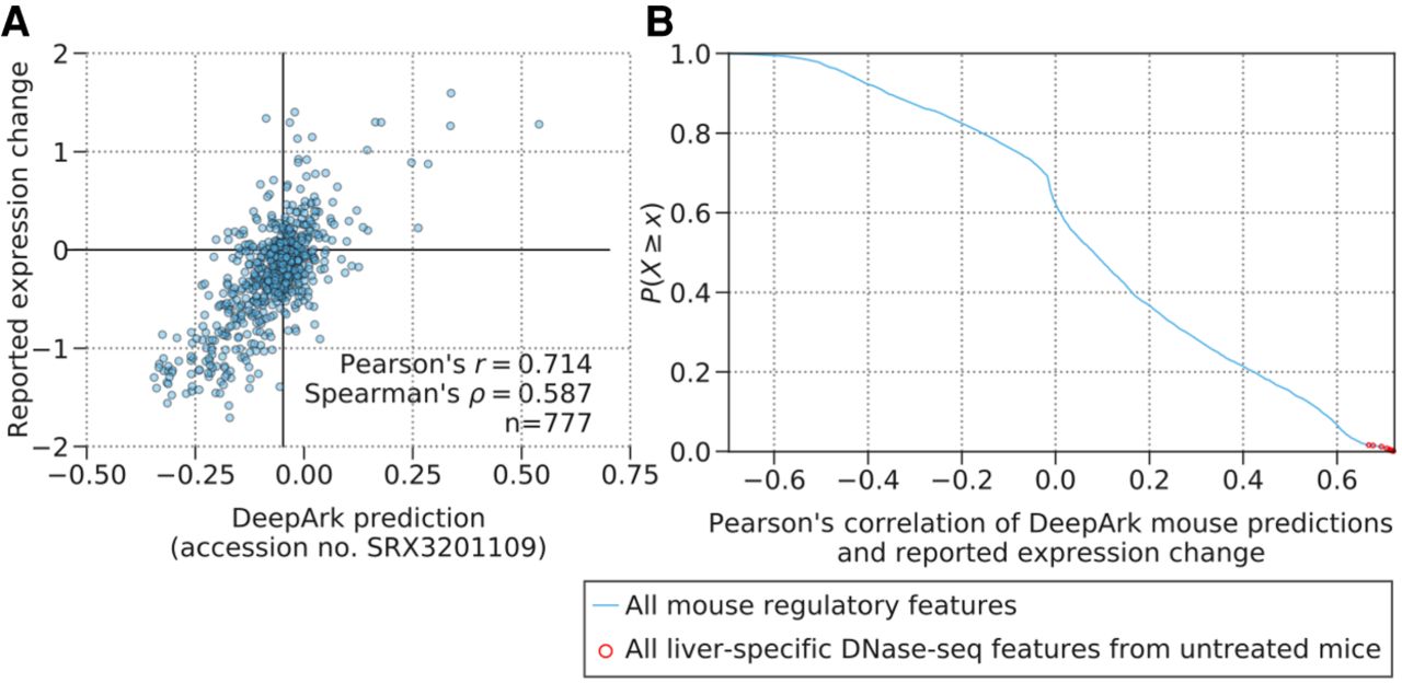 DeepArk's variant effect predictions are well correlated with variant expression effects measured in a massively parallel in vivo reporter assay (MPRA) of enhancer activity. (A) The plot shows DeepArk's predictions for a liver-specific DNase-seq experiment (accession no. SRX3201109) for all possible variants (blue circles) in the ALDOB enhancer (hg19: Chr 9: 104,195,570–104,195,828) and the expression effects measured by the massively parallel reporter assay from Patwardhan et al. (2012), which are significantly correlated (Pearson's r = 0.714, P = 3.58 × 10−122, n = 777 and Spearman's ρ = 0.587, P = 2.91 × 10−73, n = 777). Note that the high degree of correlation with this DeepArk feature and the reported expression change is representative of the high correlation witnessed for liver-specific DNase-seq predictions in general, as shown in the next panel in comparison to other features. (B) The blue line in the plot shows the empirical complementary cumulative distribution function of the Pearson's correlation between the reported expression change in the MPRA of the ALDOB enhancer performed by Patwardhan et al. (2012) and DeepArk's variant effect predictions for each regulatory feature for M. musculus. The red circles correspond to liver-specific DNase-seq experiments from mice under control conditions (accession numbers SRX188645, SRX681492, SRX681493, SRX681494, SRX681495, SRX681496, SRX681497, SRX681498, SRX681499, SRX191053, and SRX3201109). The correlations of these liver-specific DNase-seq features are especially strong (average Pearson's correlation of 0.7046, n = 11 features), which is appropriate because the MPRA in question also measures the effects on expression levels in murine livers.