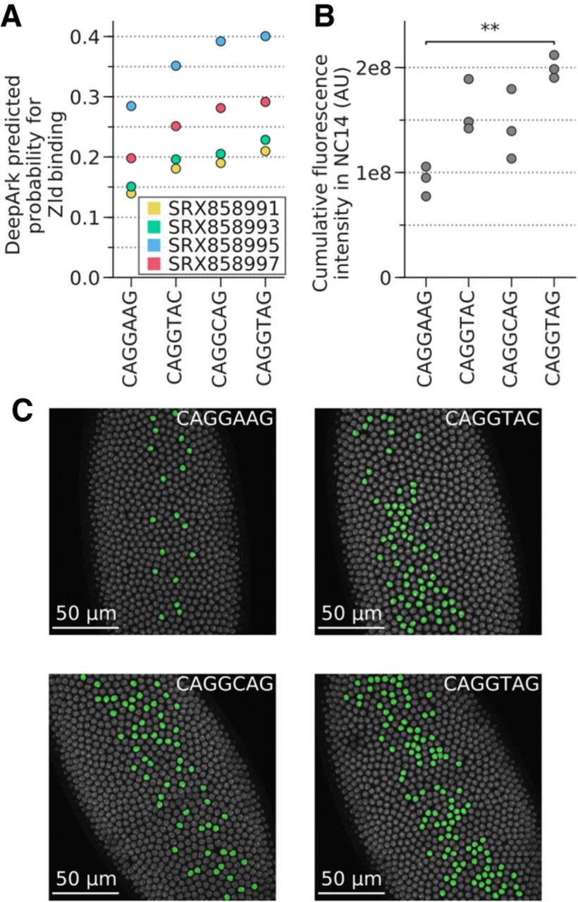 DeepArk's predicted effects for the different T48 mesodermal enhancer variants correlate with in vivo results. (A) Plot of all DeepArk predictions for Zld binding during nuclear cycle 14 for each of the four enhancer alleles. Each point represents a DeepArk prediction for a specific Zld ChIP-seq experiment and a specific allele. The CAGGTAG allele has the highest predicted probability of binding, whereas the reference allele CAGGAAG has the lowest. (B) The total transcriptional output for each of the four alleles, as quantified with in vivo MS2-GFP tagging during nuclear cycle 14. Each point in the graph represents the total transcription output (Methods) of all nuclei in a single embryo. Note that CAGGAAG and CAGGTAG have the lowest and highest transcriptional outputs, respectively, which is consistent with DeepArk's predictions. Bonferroni-corrected two-sided t-test with unequal variances: (**) P = 4.139 × 10−3; all others, P > 5 × 10−2. (C) False-color nuclei with active transcription in Drosophila embryos during minute 20 of nuclear cycle 14 illustrate the distinct levels of transcriptional activation induced by each allele (Supplemental Fig. S6). Three replicates were imaged for each allele. (AU) Arbitrary units, which represent the intensity of the pixels that correspond to the fluorescence of the MS2-GFP-tagged foci relative to the background GFP signal (Methods). (NC14) Nuclear cycle 14.