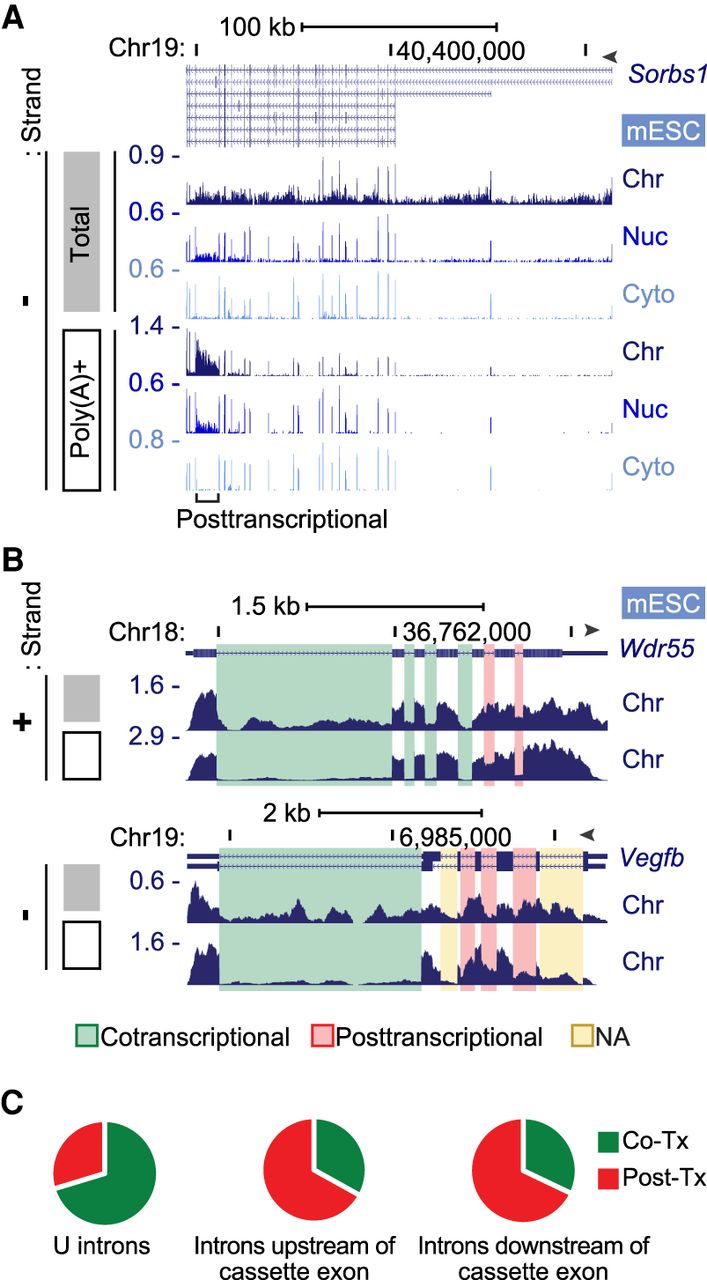 Cotranscriptional and posttranscriptional intron excision. (A) Genome browser tracks of the Sorbs1 locus in mESCs. Total chromatin RNA (gray box) shows intron reads, but the poly(A)+ RNA (open box) shows primarily exon reads except one posttranscriptional intron. (B) Genome browser tracks of chromatin RNA at the Wdr55 and Vegfb loci in mESCs. Total (gray box) and poly(A)+ (open box) are shown, with cotranscriptionally and posttranscriptionally spliced introns highlighted in green and red, respectively. Yellow highlighted introns were not analyzable owing to multiple processing patterns. (C) Proportions of co- and posttranscriptional splicing for 49,692 U introns in mESCs, using criteria described in Supplemental Figure S4, C through E. Introns upstream of (2779) and downstream from (2744) simple cassette exons were similarly analyzed.