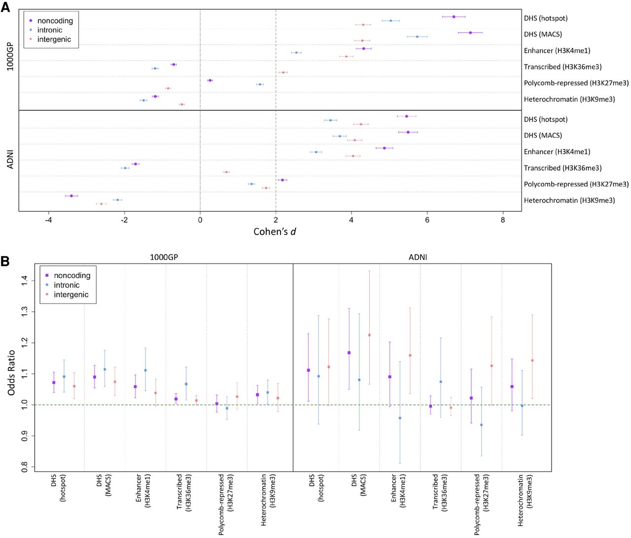 Depletion of deletions and shift of deletion allele frequency (AF) spectrum (AFS) overlapping regulatory sites. (A) We calculated PlyRSsum for every deletion to quantify overlap with sites of chromatin accessibility or histone modification. We plot the degree of reduction in the PlyRSsum for real deletions relative to simulation. This reduction is measured using Cohen's d, which is the effect size of a t-test on PlyRSsum values in units of SD (plotted with 95% confidence intervals [CIs] showing the uncertainty owing to the finite number of simulations). Two units of effect size (Cohen's d = 2) approximately correspond to the 95% CI of significance in depletion. Higher values of Cohen's d indicate larger depletion within those sets compared with simulation. In presence of the true effect, there is a sample-size dependence on the underlying t-test, and the expected value of Cohen's d would be higher for larger data sets. (B) For each deletion, we determined the magnitude of PlyRSsum depletion, calculated as a ratio between its PlyRSsum and the average PlyRSsum of its length-matched simulated counterparts, for sites of chromatin accessibility or histone modification. We tested whether PlyRSsum depletion magnitude depends on AF (deletions categorized as rare [AF ≤ 1%] or common), using multivariate logistic regression in the presence of genomic covariates. We plot the regression odds ratio with 95% profile likelihood-based CIs. Results above one indicate a positive correlation of the magnitude of PlyRSsum depletion with AF. This corresponds to an excess of rare alleles overlapping the regulatory feature in the real data set compared with simulation, which is the expected result for features being preserved by the action of purifying selection against overlapping deletions.