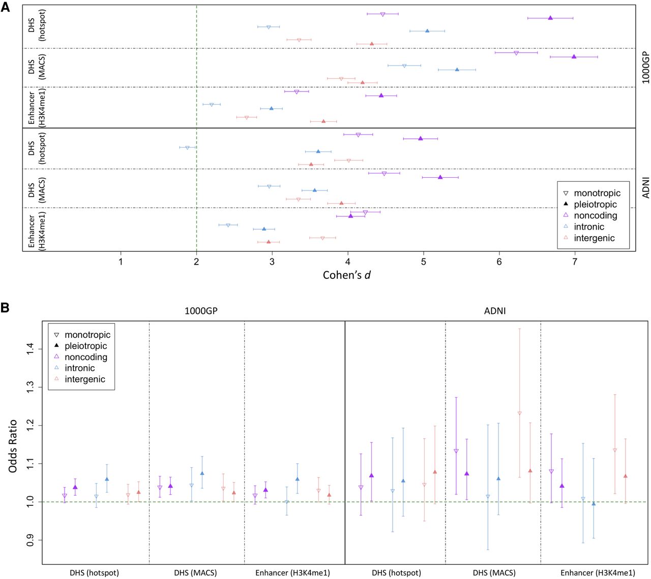 Depletion of deletions and shift of AFS overlapping DHS or enhancer sites of variable cellular activity. (A) We calculated PlyRSsum-mono (monotropic) and PlyRSsum-pleio (pleiotropic) for every deletion to quantify overlap with DHS or enhancer sites. We plot the degree of reduction in PlyRSsum-mono (or PlyRSsum-pleio) for real deletions relative to simulation measured using Cohen's d (with 95% CIs showing the uncertainty owing to the finite number of simulations). (B) For each deletion, we determined the magnitude of PlyRSsum-mono (monotropic) and PlyRSsum-pleio (pleiotropic) depletion, calculated as a ratio between its PlyRSsum-mono (or PlyRSsum-pleio) and the average PlyRSsum-mono (or PlyRSsum-pleio) of its length-matched simulated counterparts, for DHS or enhancer sites. We tested whether PlyRSsum-mono (or PlyRSsum-pleio) depletion magnitude depends on AF (deletions categorized as rare [AF ≤ 1%] or common), using multivariate logistic regression in the presence of genomic covariates. We plot the regression odds ratio with 95% profile likelihood-based CIs.