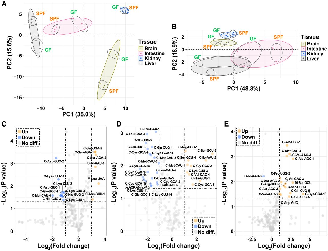 tRNA expression–related analyses at the isodecoder level. (A,B) Principal component analyses (PCAs); (C–E) Volcano plots based on the fragments per kilobase per million (FPKM) values of 216 cytosolic and 22 mitochondrial tRNAs from three tissues (n = 3, SPF vs. GF mice). (A) PCA based on the FPKM values of 216 cytosolic tRNA isodecoders. (B) PCA based on the FPKM values of 22 mitochondrial tRNA isoacceptors. (C) Volcano plot for the brains. (D) Volcano plot for the intestines. (E) Volcano plot for the livers. For C–E, P < 0.05 and log2 (fold change) > 1 were set as the thresholds of significance, and the names of the significant cytosolic tRNA isodecoders follow the names in the Genomic tRNA Database (GtRNAdb, http://gtrnadb.ucsc.edu/genomes/eukaryota/Mmusc10/). (C) Cytosolic tRNA, (M) mitochondrial tRNA.