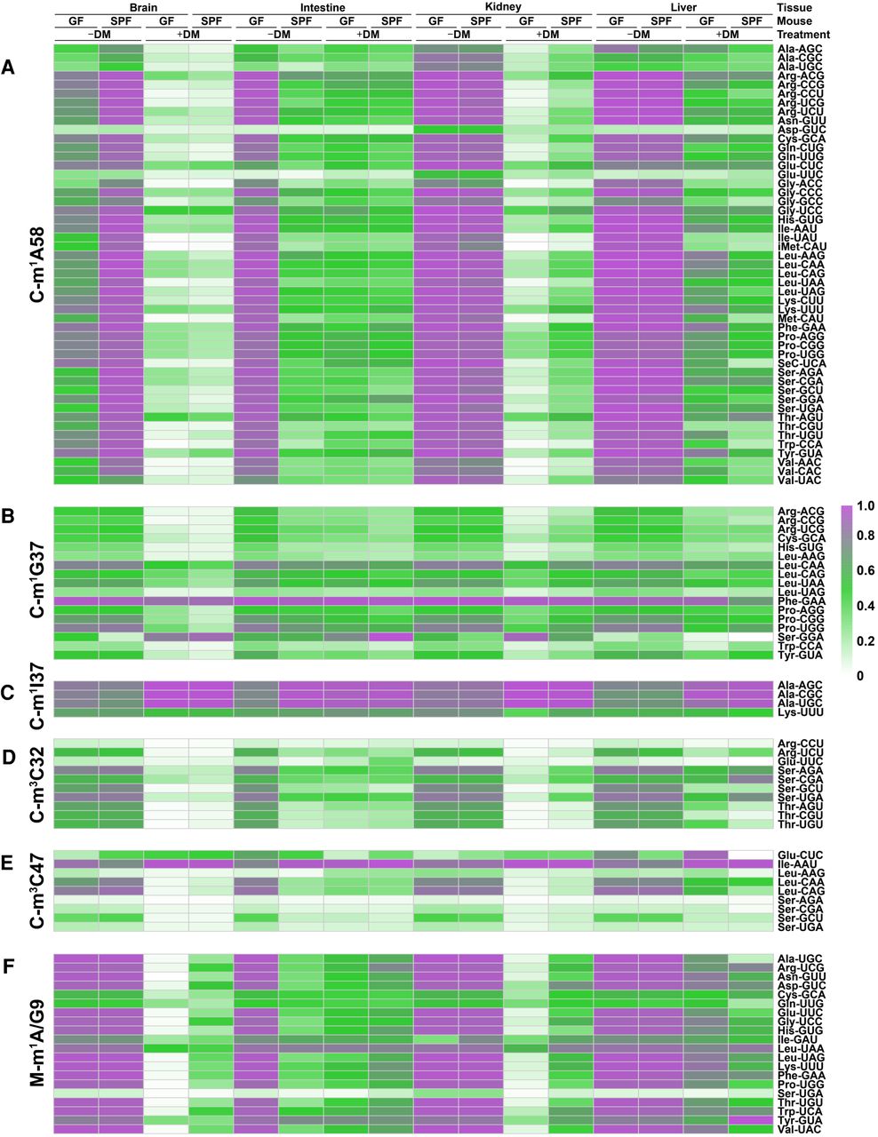 Mutation heat maps of common methylation types within cytosolic or mitochondrial tRNAs according to the standard tRNA nomenclature. The modification level of each type of tRNA methylation was semiquantified based on the corresponding mutation fraction, and presented data are from four tissues (n = 3 for both GF and SPF mice). (A) N1-methyladenosine of position 58 (m1A58) within cytosolic tRNAs. (B) N1-methylguanosine of position 37 (m1G37) within cytosolic tRNAs. (C) N1-inosine of position 37 (m1I37) within cytosolic tRNAs. (D) N3-methylcytosine of position 32 (m3C32) within cytosolic tRNAs. (E) N3-methylcytosine of position 47 (m3C47) within cytosolic tRNAs. (F) N1-methyladenosine or N1-methylguanosine of position 9 (m1A/G9) within mitochondrial tRNAs.