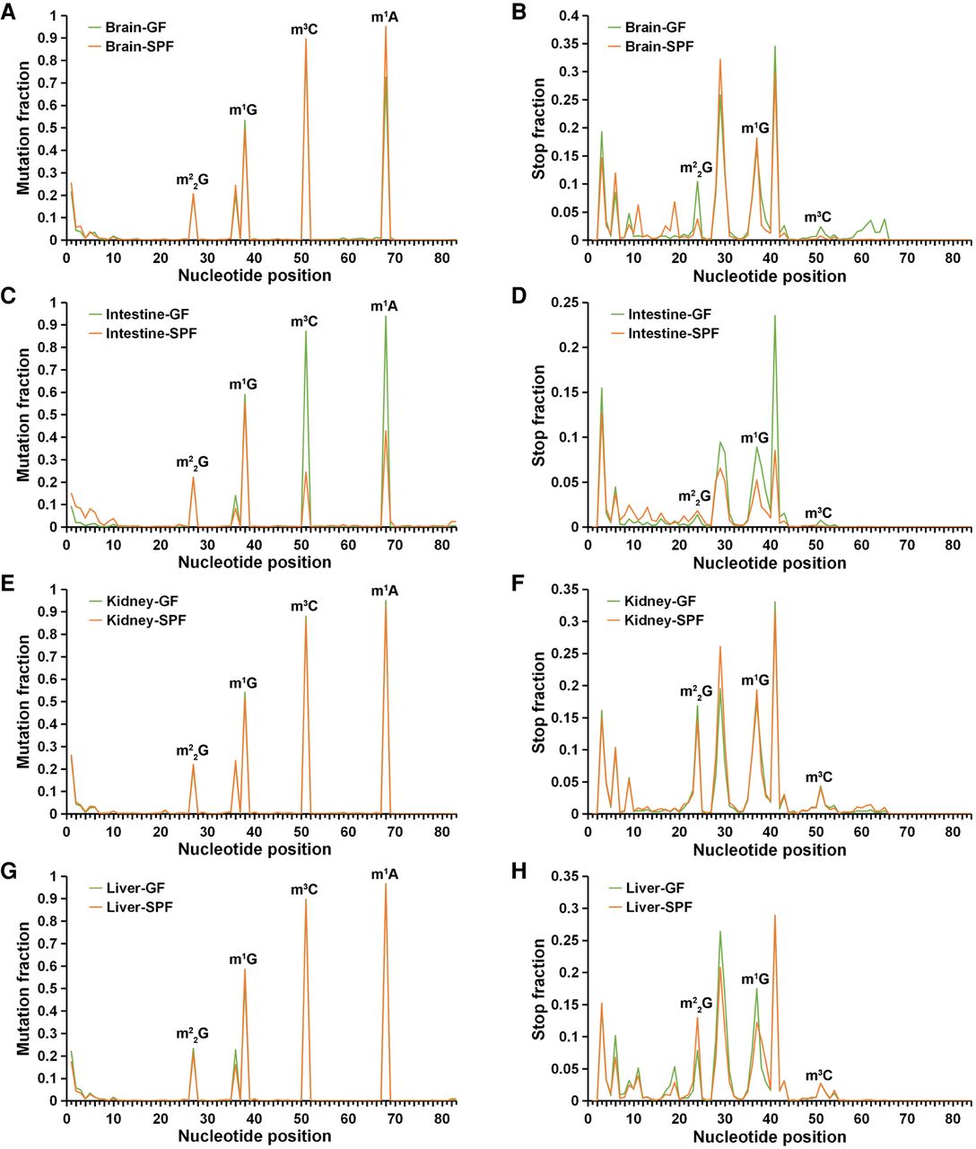 Mutation and stop plots for the cytosolic tRNALeu-CAG isoacceptor in four tissues (n = 3 for both GF and SPF mice) from the −DM libraries. (A) Mutation plot for the brains. (B) Stop plot for the brains. (C) Mutation plot for the intestines. (D) Stop plot for the intestines. (E) Mutation plot for the kidneys. (F) Stop plot for the kidneys. (G) Mutation plot for the livers. (H) Stop plot for the livers. The stop fractions at and after m1A58 are not shown. The x-axis corresponds to the nucleotide position along the tRNA. Watson-Crick face methylations that are sensitive to demethylase treatment can be easily identified from the mutation plots. (m22G) N2,N2-dimethylguanosine.