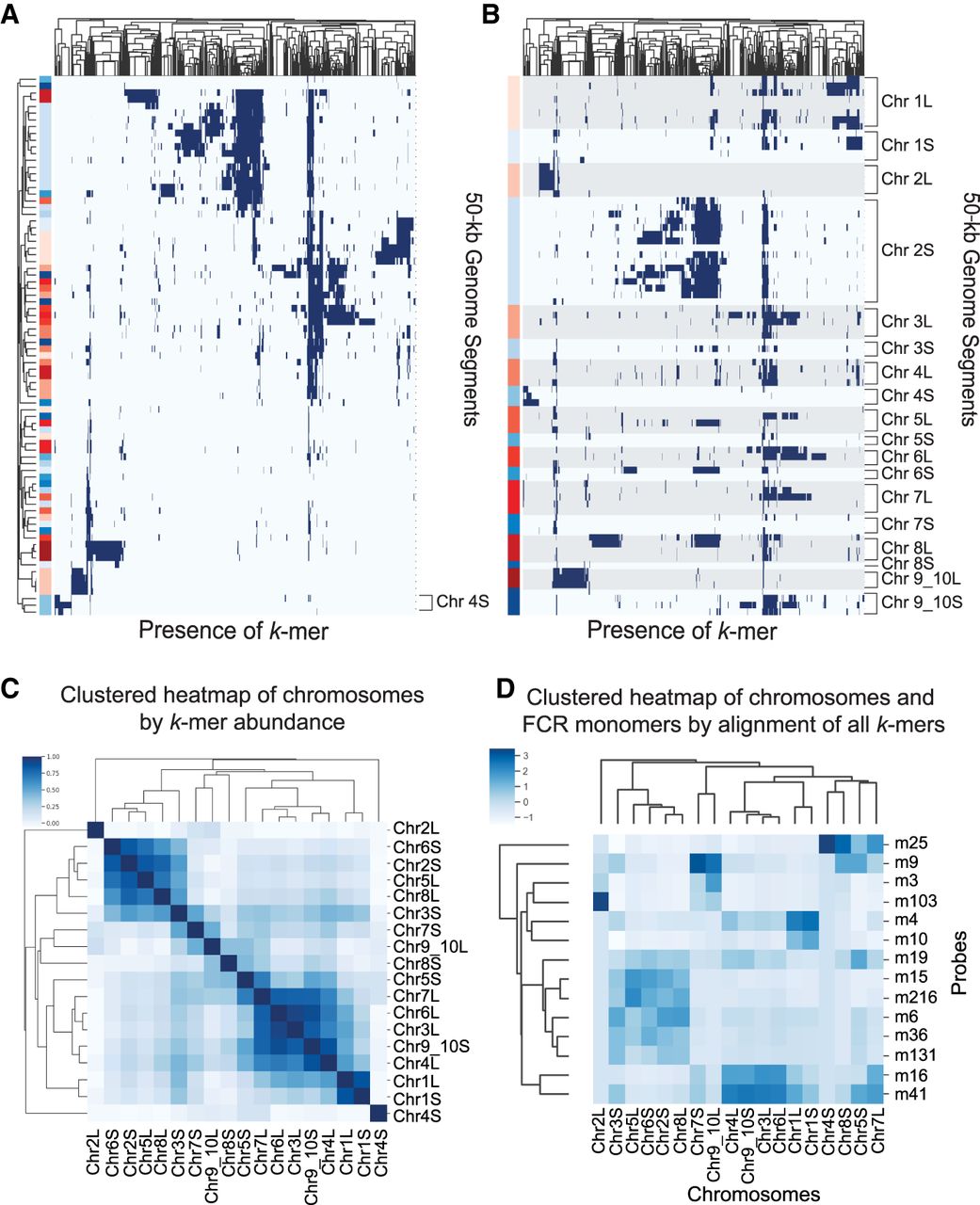 Assignment of FCR monomers to chromosomes by k-mer content. (A) Clustered heat map showing the presence (blue) or absence (white) of individual enriched k-mers on each centromeric genome segment. Both rows and columns are clustered to show k-mers and segments that display similar distributions. Genome segments, on the y-axis, are labeled on the left side indicating the L subgenome (blue), S subgenome (red). (B) Similar to A, but the genome segments, y-axis, are not ordered based on similar k-mer content and are instead listed by chromosome. L subgenome chromosomes are shaded with gray for clarity. (C) Clustered heat map of chromosomes by abundance of Cenpa-enriched k-mers. By combining 50-kb genome segments from each chromosome, an array of counts for each k-mer was used to generate a Euclidean distance between chromosomes used for clustering. Coloring of heat map is (1 − Euclidean distance). (D) Clustered heat map of counts reported from Bowtie of the number of times any k-mer from each FCR monomer aligns to each chromosomal contig.