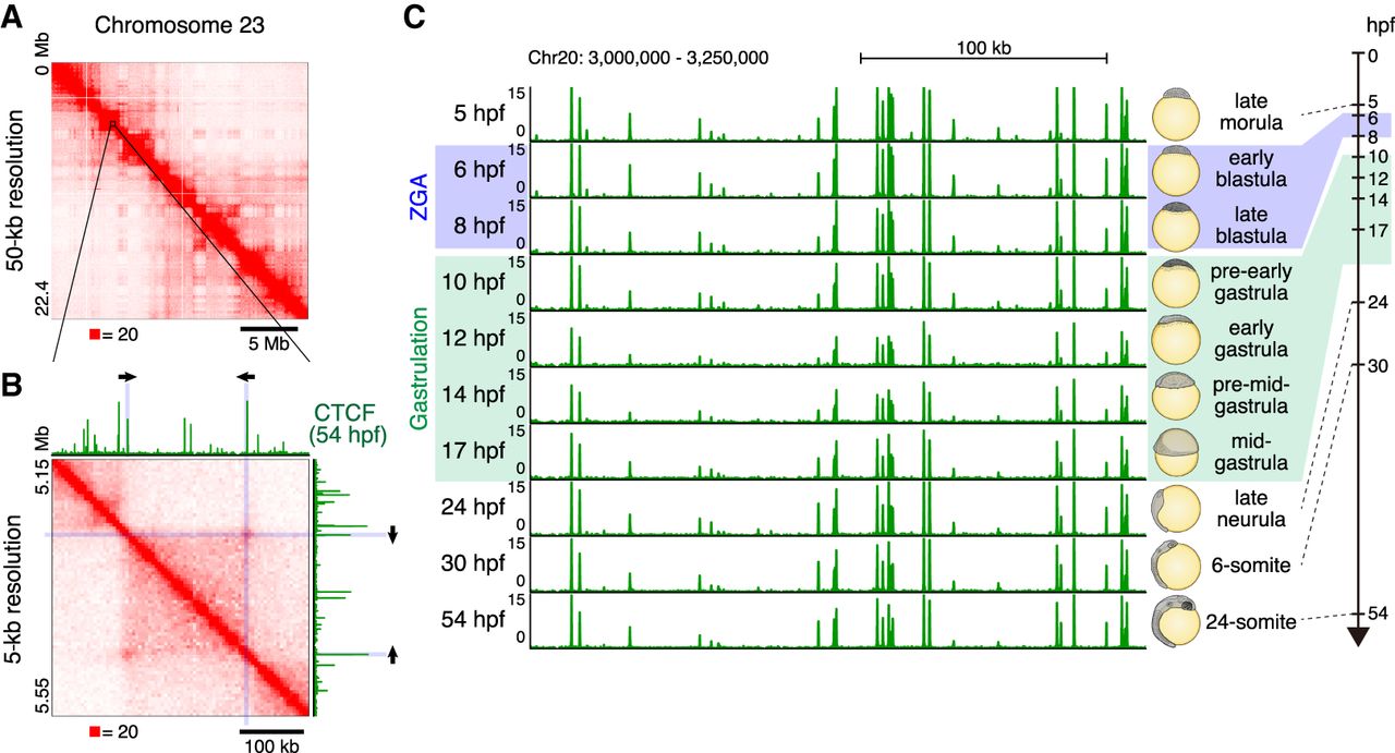 3D genome structure of medaka fibroblast cells and CTCF positioning throughout medaka development. (A) Hi-C contact map of medaka fibroblast cells. Normalized observed Hi-C contacts are shown as a heat map. Whole Chromosome 23 at 50-kb resolution shows plaid pattern. (B) Zoomed view of Chromosome 23 Hi-C contact map at 5-kb resolution and CTCF ChIP-seq track from 54-hpf embryos are shown. Arrows indicate the orientation of CTCF binding motifs within CTCF ChIP-seq peak at the loop anchor position. (C) CTCF positioning is stable throughout medaka development; representative view of CTCF ChIP-seq tracks across the developmental stages.