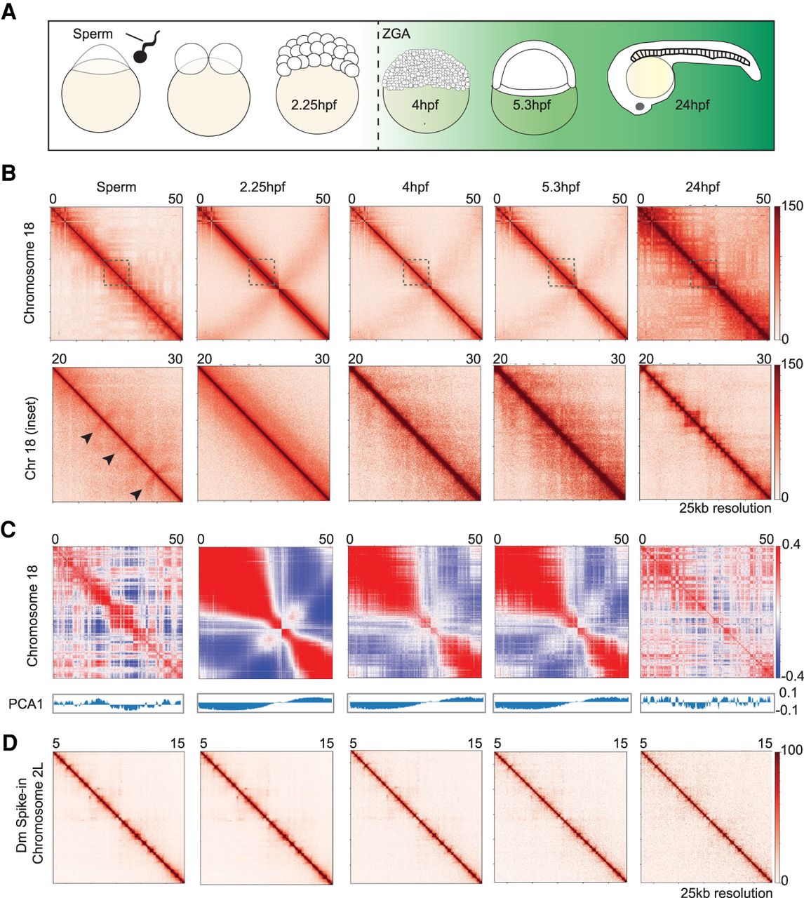 Chromatin architecture in the developing zebrafish sperm and embryos. (A) Schematic of the time points collected. Samples collected for low-cell in situ Hi-C experiments: sperm, 2.25 hpf (pre-ZGA, 128-cell), 4 hpf, 5.3 hpf, and 24 hpf. The onset of transcription during zygotic genome activation (ZGA) is ∼3 hpf in zebrafish. The transcription activity is portrayed by the green background. (B) Contact matrices of each time point from Chromosome 18 (top) inlet is marked in dashed gray box; Chr 18: 20–30 Mb (bottom), 25 kb resolution in log scale. Flares detected in sperm time point are marked by black arrows. (C) Correlation matrix of each time point from Chr 18. The first eigenvector (PCA1) for the normalized observed/expected ratio is shown below the panel to determine A/B compartment status. (D) Contact matrices of each time point from the Drosophila S2 spike-in Chr 2L: 5–15 Mb, 25 kb resolution in log scale.