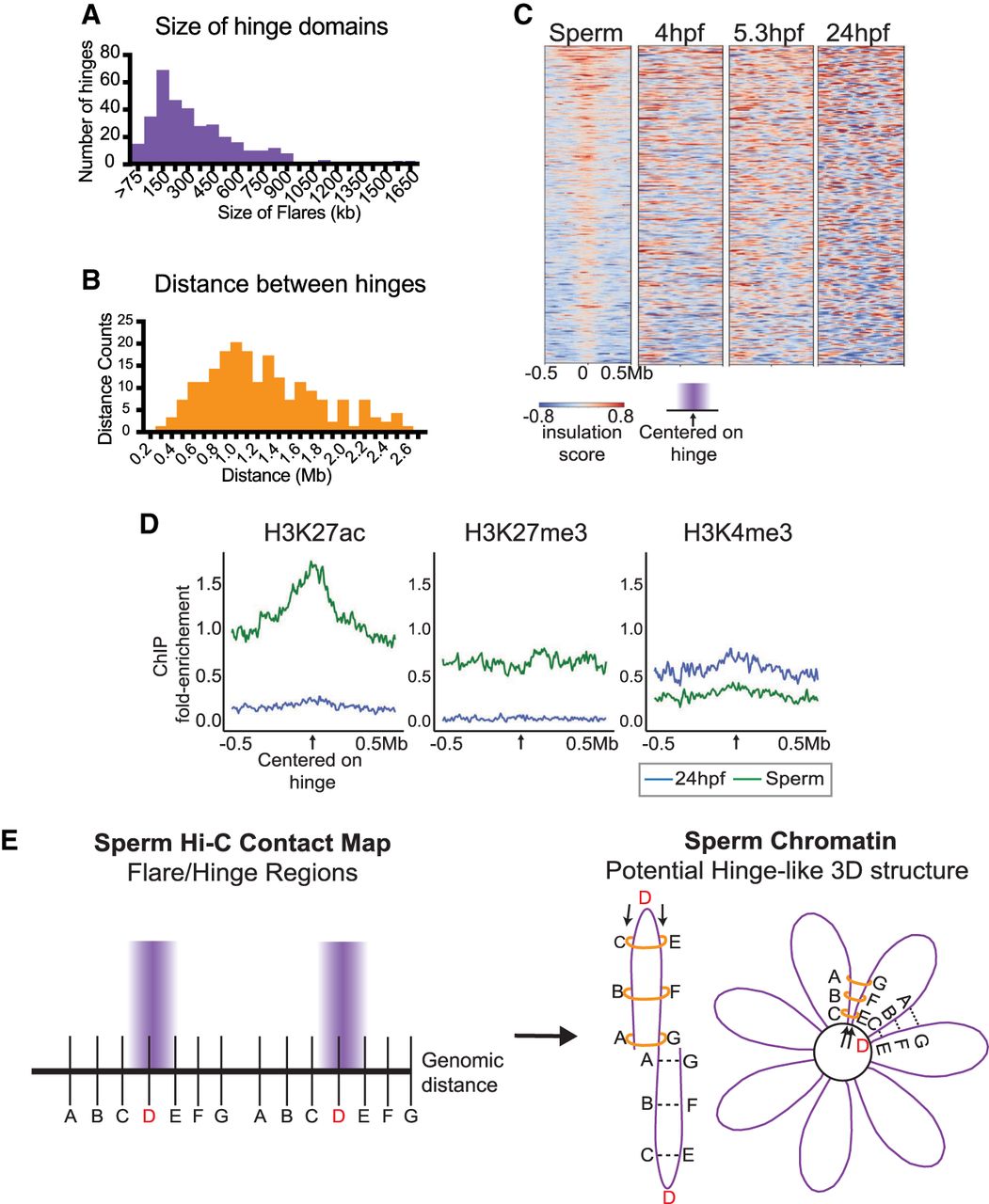 Global characterization of “hinge-like” domains in sperm chromatin architecture. (A) Histogram to depict the width distribution of the 333 hinges. (B) Histogram to depict the average distances between adjacent hinges. (C) Insulation scores at hinge-like domains in sperm, and insulation scores at the corresponding regions in embryos at 4, 5.3, and 24 hpf. Positive insulation (red) indicates increased contacts, and negative insulation (blue) indicates a lack of contacts. (D) Metaplot of log2 fold enrichment of histone H3K27ac (Zhang et al. 2018), H3K27me3 (Irimia et al. 2012), and H3K4me3 (Zhang et al. 2016) ChIP-seq signal over input for sperm (green) and 24 hpf (blue) centered on the hinge-like domains. (E) Two schematics depict two speculative models of zebrafish sperm chromatin and hinge architecture. In both models, the sperm DNA (which is nucleosome-packaged, not protamine-packaged) is arranged into arrays of consecutive loops/petals, possibly similar to the loops described for condensed mitotic chromosomes in somatic cells (Gibcus et al. 2018). Within each petal DNA positions A–G represent the repeated “hinge” unit within each petal, with “D” representing the hinge center, and the segments A–C and E–G representing the edges of the hinge “petals.” A key feature of the contact map data is that locations equidistant from position D show increased interaction. Two models are presented to achieve this: (1) interactions are caused by contacts within each petal (left), or (2) interactions are caused by contacts between two petals (right). In both models, we propose a constraint on topology, which might involve the loading of ring-like proteins (e.g., condensin or cohesin complexes) at the hinge position D (left) which, together with the fixed hinge position D, create the hinge-like domain through loop extrusion. Ring-like proteins are represented by orange rings. Arrows on the left indicate potential locations where ring-like proteins might load, at hinge position D, to help form stable hinges.