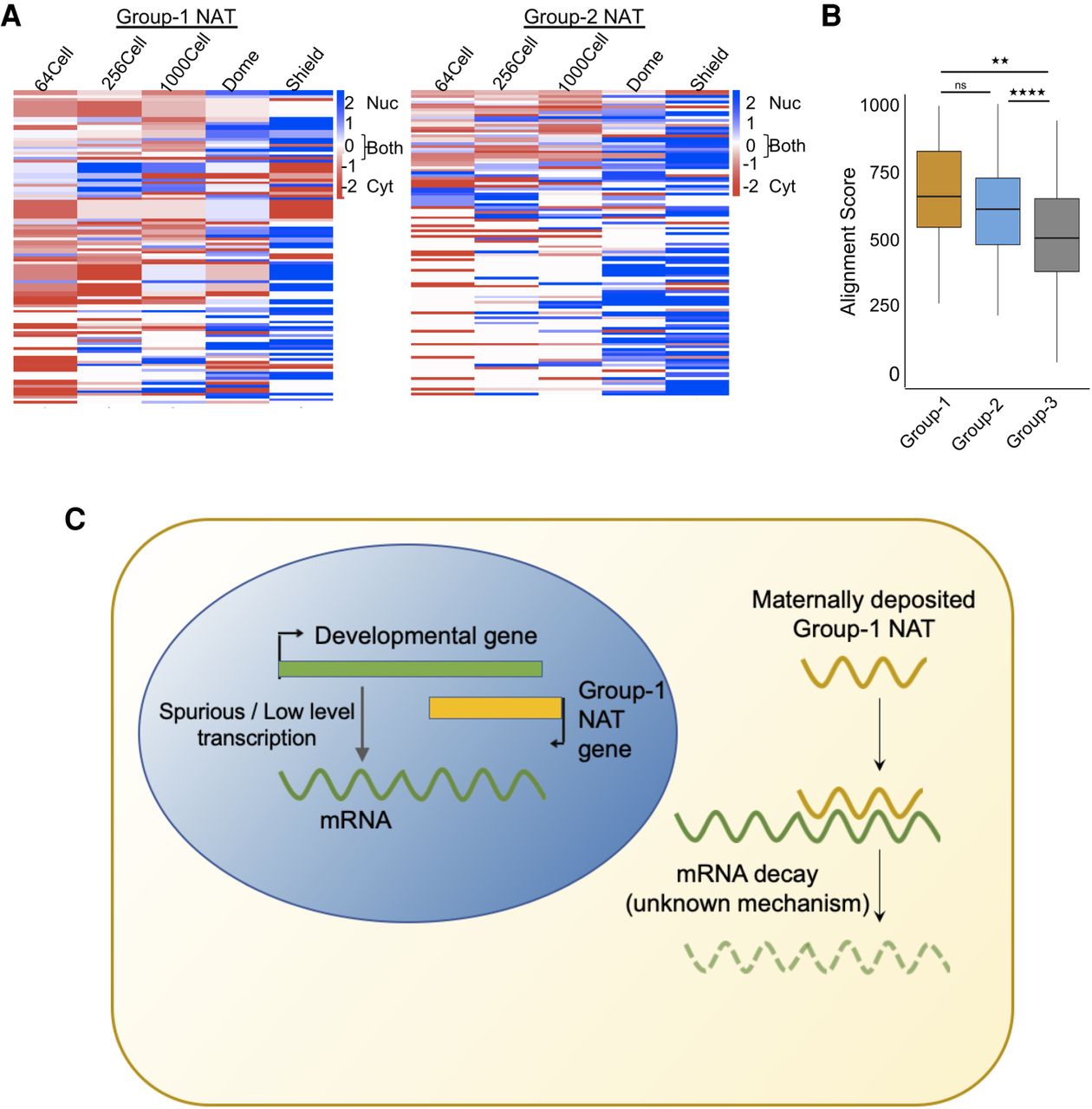 Localization of NATs during zebrafish development. (A) Heatmaps showing the localization of Group 1 and Group 2 NATs during zebrafish development. The scales are from −2 (red, cytosolic) to 2 (blue, nuclear) and 0 (white, both). (B) A box plot of the alignment score between NATs and overlapping mRNA sequence in Group 1 (yellow), Group 2 (blue), and Group 3 (gray). Each box shows the median value (as horizontal lines) and extends from the 25th to 75th percentile values for each group. The outliers are shown as dots. The significance values are as follows: (**) P < 0.005; (****) P < 0.0001; (ns) nonsignificant (unpaired, two-tailed t-test). (C) A schematic model showing probable mechanism of Group 1 NATs in down-regulating developmental genes.