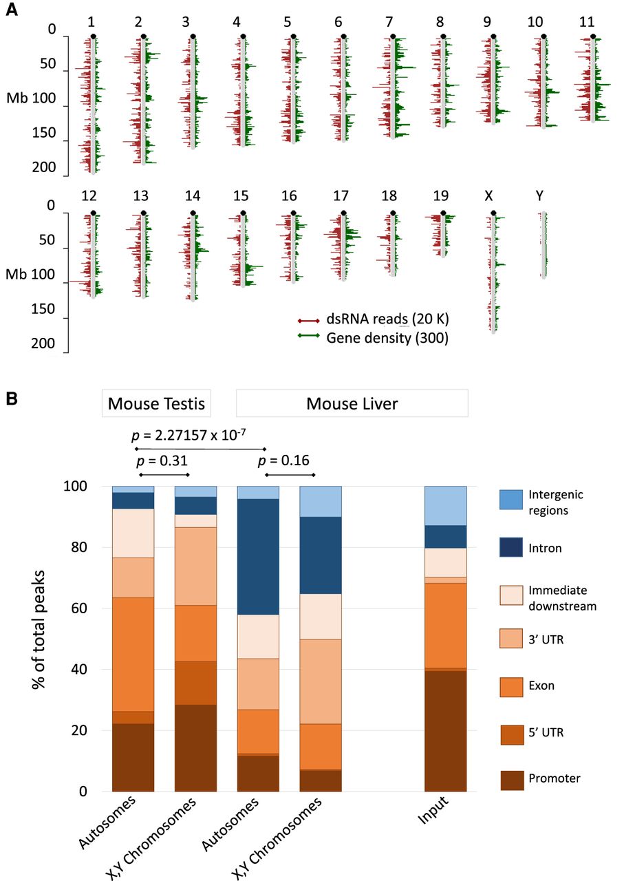 dsRNA transcriptome of combined mouse testis samples and liver. (A) Chromosomal distribution of dsRNA reads from testis. The dsRNA reads are in red; annotated protein-coding and noncoding genes in green are for comparison. dsRNA reads and genes show a comparable pattern. Sex chromosomes display less dsRNA compared to autosomes. The bars represent dsRNA read- or gene density per million bases. (B) J2 antibody enriched reads from mouse testis and liver were aligned and quantified; the input from mouse liver served as a control. The resulting peaks were then annotated to biotypes (color-coded as indicated) using ChIPpeakAnno. Features related to the regulation or the structure of annotated transcripts (promoters, exons, UTRs, and immediate downstream regions; GENCODE.vM20.annotation.gff3) are shaded in brown. Introns and intergenic regions are in shades of blue. Promoters encompass 1000 bp upstream of the transcription start; “immediate downstream” includes 1000 bp downstream from the transcript end. Autosomes and sex chromosomes are displayed in separate columns because sex chromosomes are enriched in repetitive elements and depleted in natural antisense transcripts, both of which are associated with dsRNA formation. The pipeline is described in the Methods and graphically outlined in Supplemental Figure S1.
