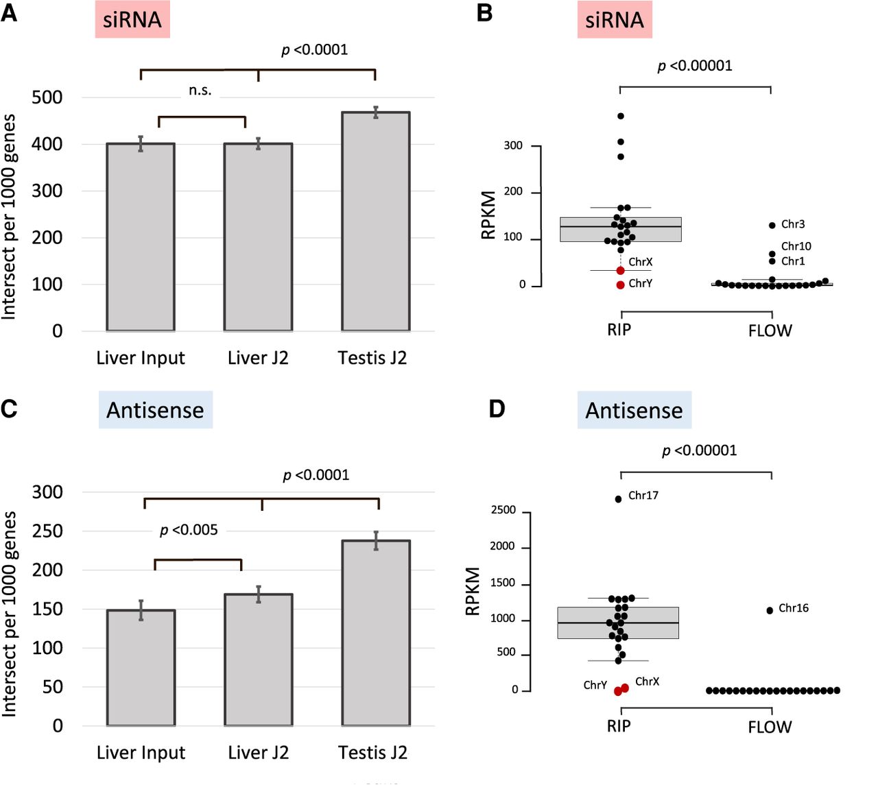 Reads in J2-enriched samples that intersect with endo-siRNAs (Hilz et al. 2017) and antisense transcripts. Samples from testis and liver as well as the flowthrough (FLOW) were analyzed, the upper panel (A,B) showing the overlap with siRNA forming genomic regions, the lower panel (C,D) with antisense genes. (A) Number of intersected genes per 1000 genes, dsRNA samples from testis show significantly more genes that generate endo-siRNAs than both J2-enriched samples and input control from liver. (B) Normalized number of fragments on individual chromosomes per megabase in combined RIP samples from mouse testis as compared to FLOW samples. Each dot represents a specific chromosome; the box plot indicates the median, 25th, and 75th percentiles as box limits and 1.5 times the interquartile range (whiskers); Chromosomes 1, 3, and 10 are clear outliers in the FLOW samples (Supplemental Fig. S3). The sex chromosomes tend to show a lesser overlap between dsRNA and endo-siRNA formation even if the lower number of dsRNA peaks is considered. (C) Number of dsRNA-forming genes intersected with antisense genes. The coordinates of 2991 antisense genes were retrieved and lists of 1000 randomly selected genes were intersected with lists from testis (1000 of 3492) and liver (1000 of 4900 J2 and 1000 of 4061 input control). The dsRNA-associated genes in both testis and liver are significantly associated with antisense genes (P < 0.0001 and P < 0.005, respectively). (D) Total number of reads on individual chromosomes per megabase in combined RIP and FLOW samples that intersect with antisense transcripts. The box plot gives the median, 25th, and 75th percentiles as box limits and 1.5 times the interquartile range (whiskers); Chromosome 16 represents an outlier in the FLOW samples.