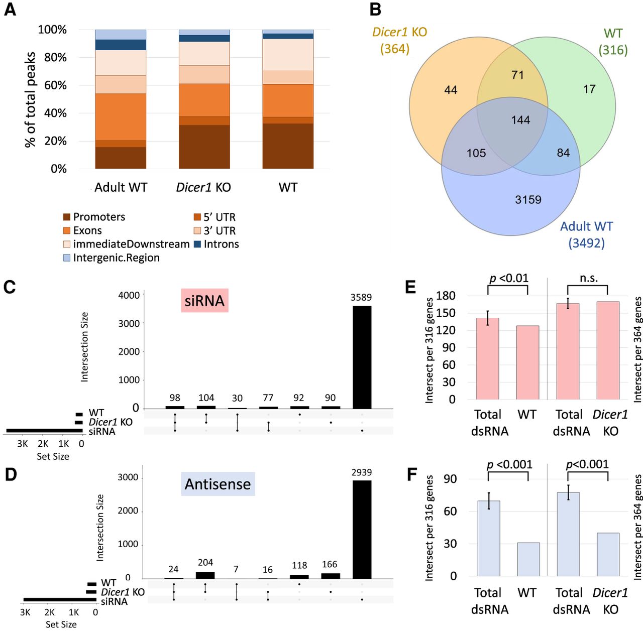 dsRNA formation in juvenile Dicer1 KO mice and age-matched wild-type controls. (A) dsRNA peaks in the three samples (Adult WT, Dicer1 KO, and WT) were annotated to biotypes using ChIPpeakAnno: Promoter, 5′ UTR, exon, 3′ UTR, immediate downstream (1000 bp) are in shades of brown, and introns and intergenic regions are in shades of blue. (B) Venn diagram depicting the genes associated with dsRNA peaks in Dicer1 KO, WT, and adult mouse testis and the overlaps between the samples. (C) The coordinates of genes associated with peaks in Dicer1 KO samples and WT controls were intersected with the coordinates of siRNA-associated genes (in red) (Hilz et al. 2017) and antisense genes (in blue) in D, respectively, and visualized in upset plots. In both cases, the Dicer1 KO specific genes show greater association with siRNA-associated and antisense genes (siRNA 77 vs. 30, antisense 16 vs. 7). (E) Number of dsRNA-associated genes in Dicer1 KO and WT controls that intersect with siRNA-associated genes, compared to an average of 10 size-matched random samples from the total dsRNA gene set. (F) Number of dsRNA-associated genes in Dicer1 KO and WT controls that intersect with antisense transcripts compared to the control total dsRNA gene set. Significance was determined by one-sample t-test.