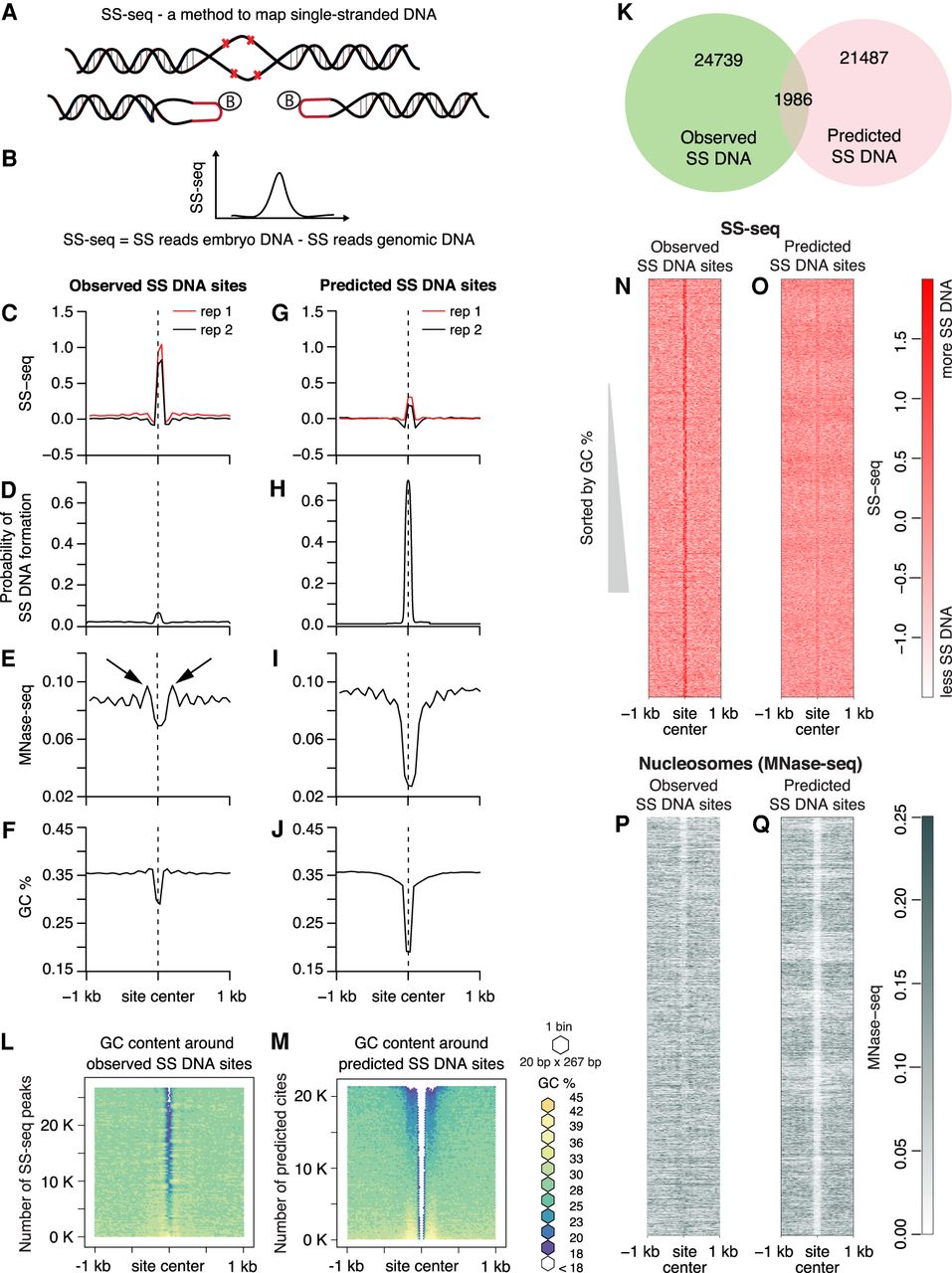 Nucleosome positioning and AT-rich regions correlate with single-stranded DNA. (A,B) Strategy for genome-wide mapping of single-stranded DNA (SS-seq). (A) When KMnO4 enters purified nuclei, it modifies unpaired pyrimidine bases and prevents reannealing, creating stable single-stranded (SS) DNA. To map non-B DNA, purified KMnO4-treated DNA is digested with the single-strand-specific S1 nuclease, and exposed DNA ends are ligated to biotinylated hairpin adapters. Following DNA sonication to generate 300-bp fragments, biotinylated DNA ends are enriched on streptavidin beads, and a second set of adapters is ligated. After digestion of adapter hairpins, the library is amplified and sequenced. The same procedure is applied to naked genomic DNA as a control. Details of the method are in Supplemental Figure S8A. (B) The distribution of the difference in counts from KMnO4-treated nuclear DNA and genomic control DNA is calculated genome-wide. The SS-seq signal represents the residual signal obtained by subtracting SS reads from naked genomic DNA from the SS reads from embryo DNA. Sites of KMnO4 reactivity are identified by peaks in the SS-seq signal. (C–J) Multiparamteric comparison of observed SS-seq peaks and predicted single-stranded regions. Average profiles of SS-seq in the 2-kb region around observed (C) and predicted (G) SS DNA sites were plotted at 50-bp resolution. Average profiles of SIST-predicted probability of strand separation in the 2-kb region surrounding observed (D) and predicted (H) SS DNA sites. Nucleosome profile (MNase-seq) in the 2-kb region around observed (E) and predicted (I) SS DNA sites. Black arrows indicated well-positioned nucleosomes. Average GC content in the 2-kb region around observed (F) and predicted (J) SS DNA sites is plotted at 50-bp resolution. (K) Venn diagram shows intersection between predicted and observed SS DNA sites. (L,M) Heatmaps of GC content in the 2-kb region around observed SS-seq peaks and predicted SS DNA sites. SS-seq peaks and predicted sites were sorted by GC content; the surrounding sequences were aligned on top of each other and then binned (20 bp × 267 bp for L and 20 bp × 215 bp for M). Each bin was colored according to its GC percentage. (N,O) Heatmaps of SS-seq signal in the 2-kb region surrounding observed SS-seq peaks and predicted SS DNA sites that were sorted as in L and M. (P,Q) Heatmaps of MNase-seq in the 2-kb region around observed SS-seq peaks and predicted SS DNA sites, which were sorted as in L and M.