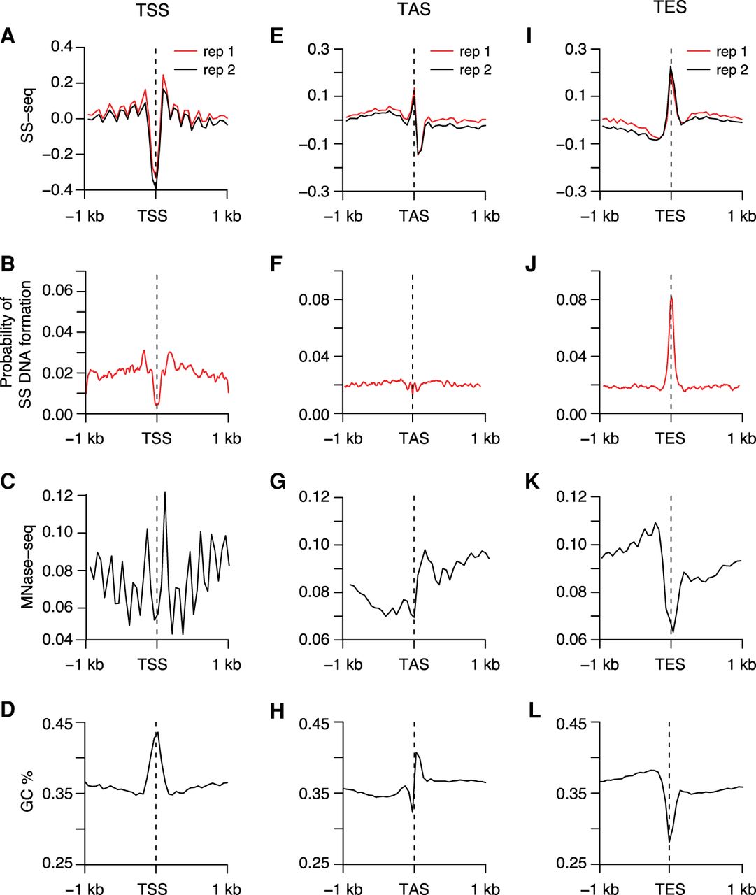 SS DNA is a universal feature of TASs and TESs but not TSSs. (A,E,I) Average profiles of SS-seq in the 2-kb region around TSSs (A), TASs (E), and TESs (I) are plotted at 50-bp resolution. (B,F,J) Plots show average profiles of the SIST-predicted probability of strand separation in the 2-kb region surrounding TSSs (B), TASs (F), and TESs (J). (C,G,K) Plots of nucleosome profiles (MNase-seq) in the 2-kb region surrounding TSSs (C), TASs (G), and TESs (K) show that nucleosome positioning corresponds with SS DNA at TASs and TESs. (D,H,L) Average GC content is plotted in the 2-kb region around TSSs (D), TASs (H), and TESs (L) at 50-bp resolution.