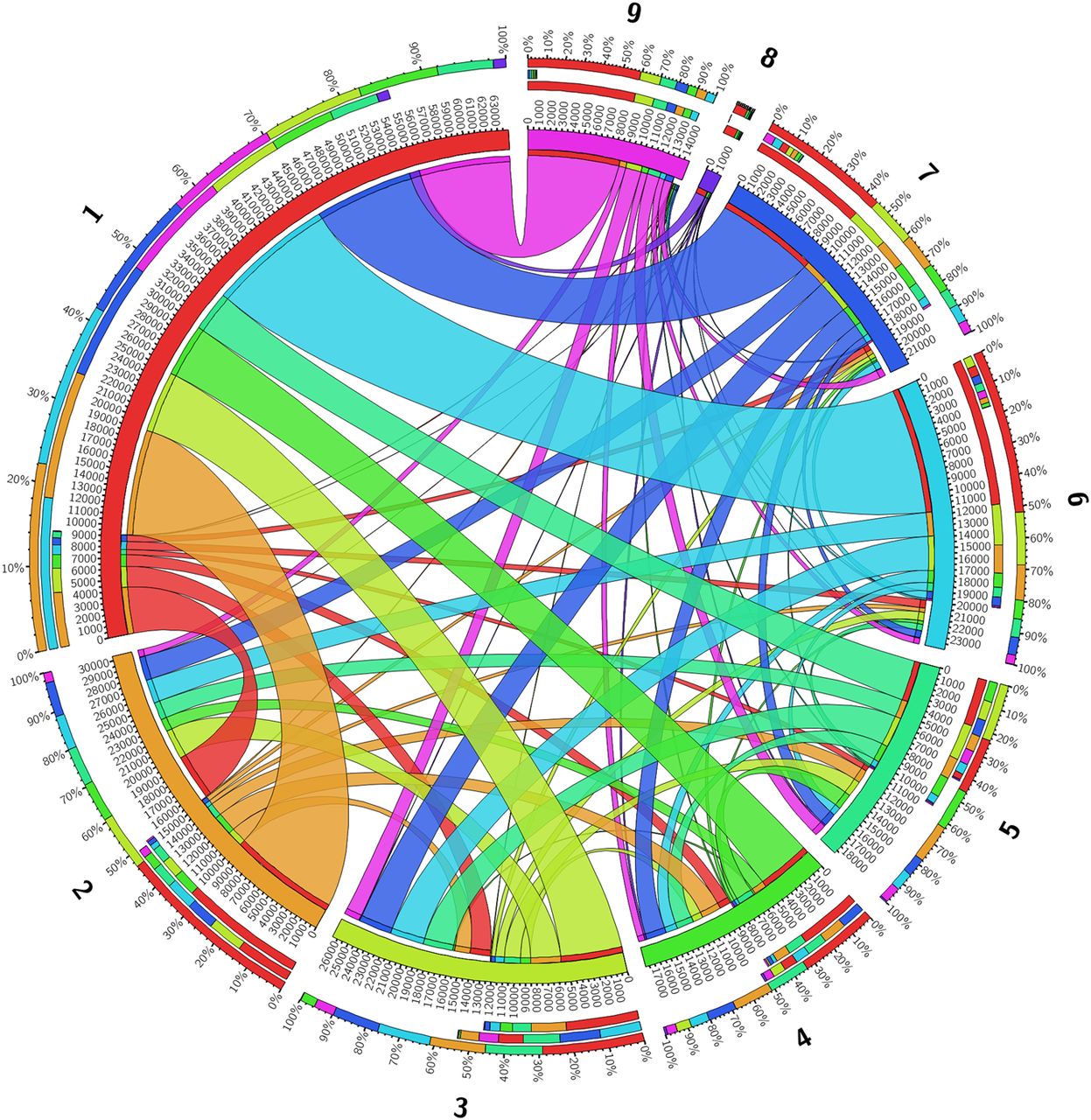 Chord diagram of the count of recombinant regions identified by fastGEAR between the clusters in the Burkina Faso N. meningitidis carriage collection. Clusters are positioned on the main circle of the diagram, with the arc length of the cluster indicating the number of recombination events. Linkages between clusters represent the number of recombinant regions occurring between those clusters with their width representing the number of regions and the color indicating the donating lineage. The three stacked bars outside the main diagram indicate, from outermost to innermost, the proportion of the total number of recombinant regions in each cluster colored by the other cluster involved, those same proportions only for the count of recombinant regions received, and those proportions for regions donated in the focal cluster.
