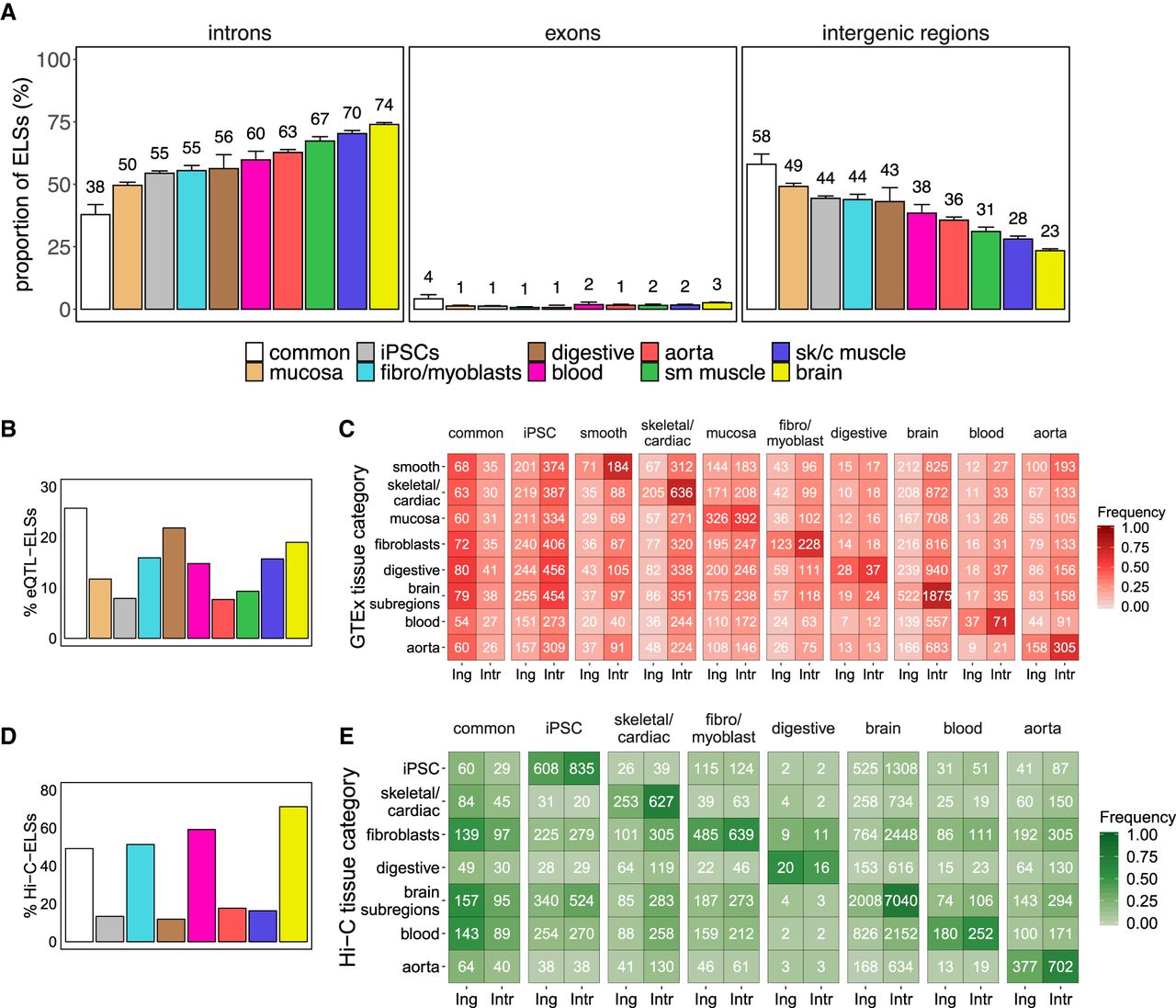 Intronic location of tissue-specific ELSs. (A) Proportions of common and tissue-specific ELSs, identified in the 33 selected human adult samples that overlap intronic, exonic, and intergenic regions. Error bars represent the 95% confidence interval. (sk/c) skeletal/cardiac, (sm) smooth). (B) Proportion of eQTL-ELSs with respect to the total amount of ELSs in each cluster. (C) Number of intergenic (Ing) and intronic (Intr) cluster-specific ELSs harboring eQTLs detected in the analyzed GTEx tissue samples. Common and iPSCs-specific ELSs were annotated with a composition of tissue-specific significant eQTLs (see Methods). Colored cells represent the proportion of region-specific eQTL-ELSs over the total amount of eQTL-ELSs per cluster. Significant differences were observed between common and tissue-specific annotated eQTL-ELSs (χ2test P-value ≤ 0.05), showing that common annotated ELSs are highly associated with intergenic regions. (D) Proportion of Hi-C-ELSs with respect to the total amount of ELSs in each cluster. (E) Number of intergenic and intronic cluster-specific ELSs overlapping Hi-C-based detected fragments in the analyzed Hi-C tissue samples. Common ELSs were annotated with a composition of tissue-specific significant Hi-C fragments (see Methods). Colored cells represent the proportion of Hi-C-ELSs over the total amount of tissue-specific Hi-C-ELSs per cluster. Significant differences were observed between common and noncommon annotated Hi-C-ELS (χ2 test P-value ≤ 0.05).