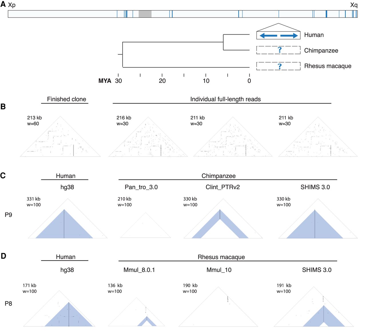 Improvements to prior reference assemblies for chimpanzee and rhesus macaque. (A) Sequencing approach. Top bar: Locations of 26 human X palindromes (blue bands). Gray band shows centromere location. Bottom: Expansion of a single region containing a human X palindrome (solid black box). One or more clones were selected to span orthologous regions in chimpanzee and rhesus macaque (dashed black boxes). Tree shows estimated divergence times from TimeTree (Kumar et al. 2017). (B) Full-length nanopore reads supporting the structure of a single finished chimpanzee clone (CH251-385I8). (C,D) Two primate X palindromes resolved using SHIMS 3.0 that were missing or misassembled in existing X-Chromosome assemblies. (C) Triangular dot plots from the region orthologous to human P9 in chimpanzee assemblies Pan_tro_3.0 (Kuderna et al. 2017), Clint_PTRv2 (Kronenberg et al. 2018), and SHIMS 3.0. (D) Triangular dot plots from the region orthologous to human P8 in rhesus macaque assemblies Mmul_8.0.1 (Zimin et al. 2014), Mmul_10 (Warren et al. 2020), and SHIMS 3.0.