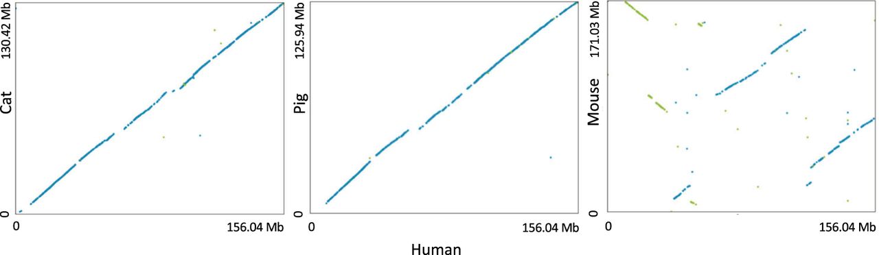 Pairwise X Chromosome alignments between human and cat, human and pig, and human and mouse.