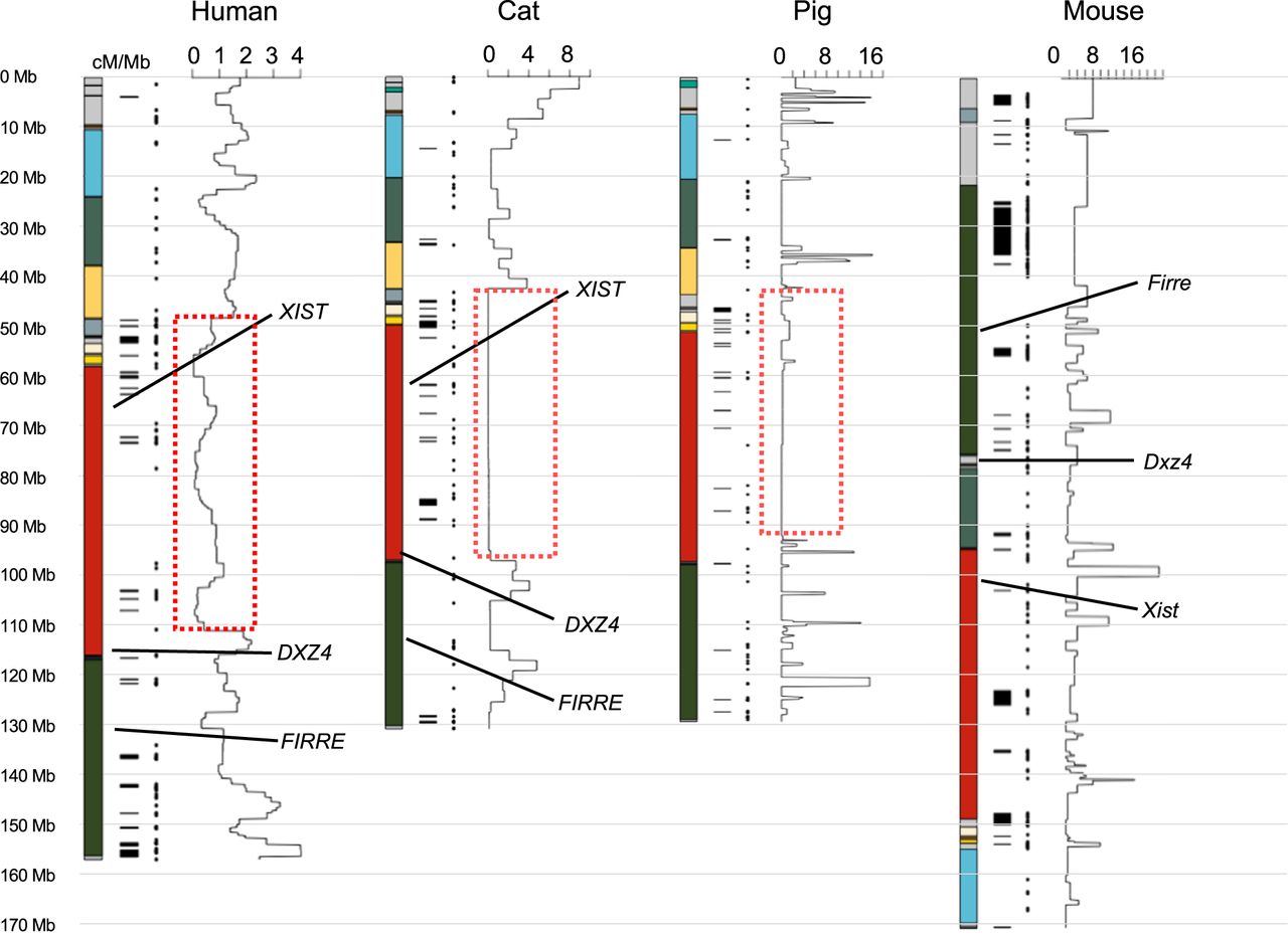 Interspecific comparison of four mammalian X Chromosomes. Ideograms of the human, cat, pig, and mouse X Chromosomes with areas of conserved synteny shown in colored bands. For each X Chromosome, the ampliconic regions are shown to the right as black bars, and the locations of lineage-specific gene gains are to the right of these bars depicted as black dots. Regional rates of recombination are plotted along the length of each X Chromosome, and the shared recombination cold spot is outlined in the dashed red box for the human, domestic cat, and pig.