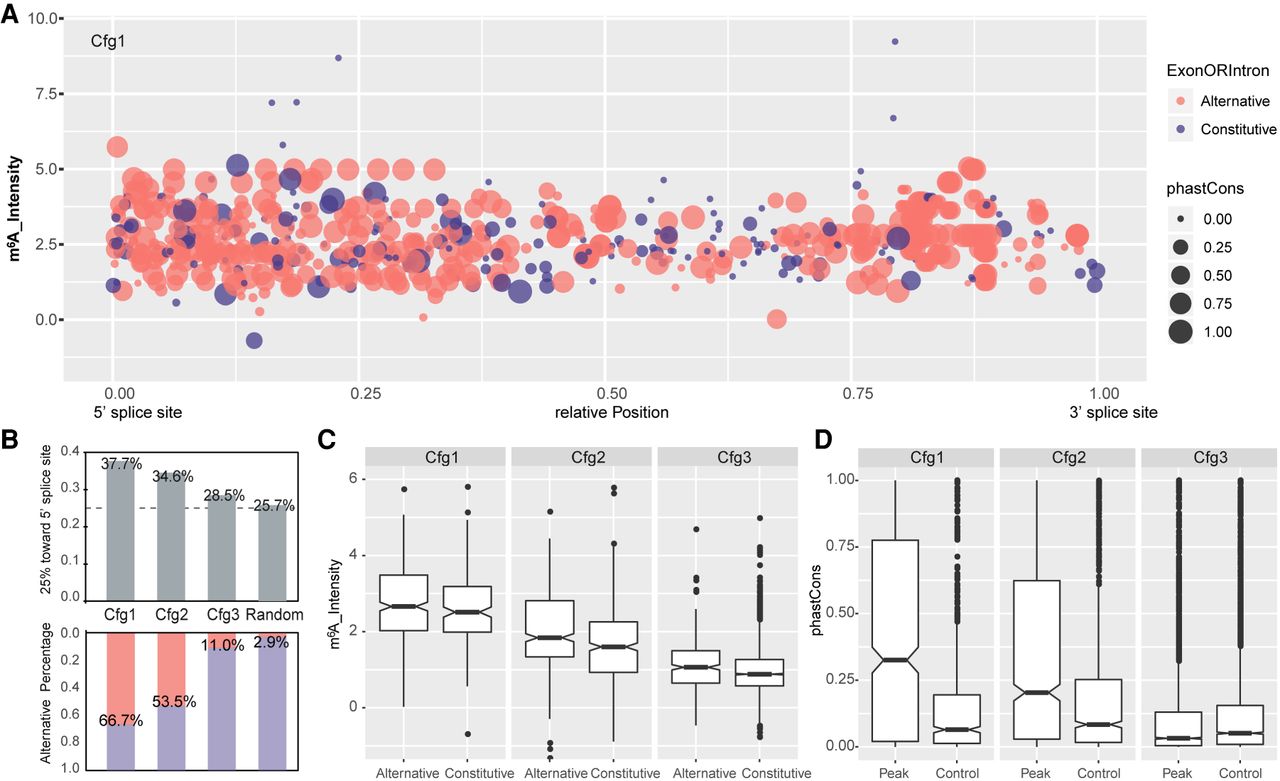 Patterns of intronic m6A modification. (A) Dot plots show the relative position, m6A intensity, conservation, and location in alternative or constitutive introns for all intronic m6A methylation in Cfg1. Here, 0 and 1 in the x-axis represent the 5′ and 3′ splice sites, respectively. The y-axis denotes m6A intensity calculated as an average of all replicates. Dot area indicates the phastCons conversation score. Red and blue denote location in alternative and constitutive introns, respectively. (B) Bar plots (top) showing the fraction of m6A peaks located in the first quarter (close to the 5′ splice site) of introns for Cfg1, Cfg2, and Cfg3 classes, as well as random simulated peak summits. Bar plots (bottom) showing the fraction of m6A peaks located in alternative exon/introns for all the groups. The percentages for each bar are labeled. (C) Box plots showing intensity of intronic m6A peaks located in alternative and constitutive introns for all classes. (D) Box plot of phastCons scores for all classes of m6A peaks located in intron regions annotated from the MaxORF_LongestNcRNA isoforms, compared with controls matched for size and intron-of-origin.