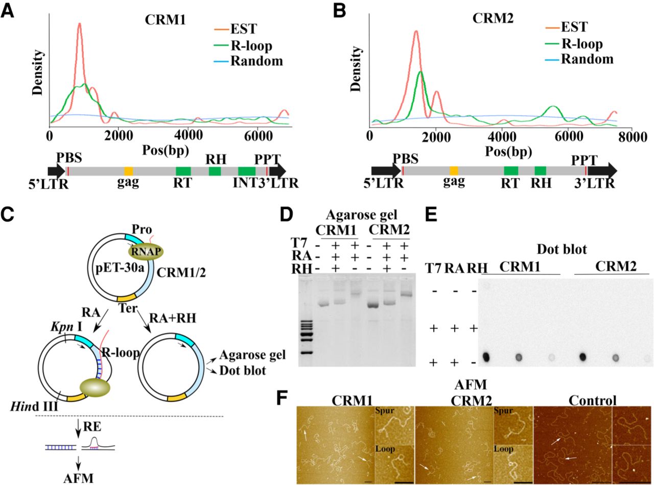 Contribution of CRM1 and CRM2 to R-loop formation in the maize centromere. (A,B) Distribution of R-loops and ESTs on CRM1 (A) and CRM2 (B). The blue line represents the distribution of 10,000 randomly selected 150-bp reads that were used as controls for comparison. The red and green lines represent the distribution of ESTs and R-loops, respectively. The entire CRM1 and CRM2 elements are shown below with domains highlighted. (RT) Reverse transcriptase, (RH) RNase H, (INT) integrase. (C) Diagram of the main steps of the in vitro transcription system. (RE) Restriction enzyme, (RH) RNase H, (RA) RNase A (Pro) promoter, (Ter) terminator, (RNAP) RNA polymerase II. (D,E) The circular plasmids pET-30a-CRM1/CRM2 were transcribed in vitro and treated or not with RNase H or RNase A as indicated. After purification, the DNA was run on agarose gels (D) or spotted on a membrane to perform dot blot analysis with the anti-S9.6 antibody (E). (F) pET-30a-CRM1/CRM2 and pET-30a-Control were processed as in Figure 4C and visualized using AFM. Magnifications of the molecules are identified by arrows. Scale bar = 200 nm.