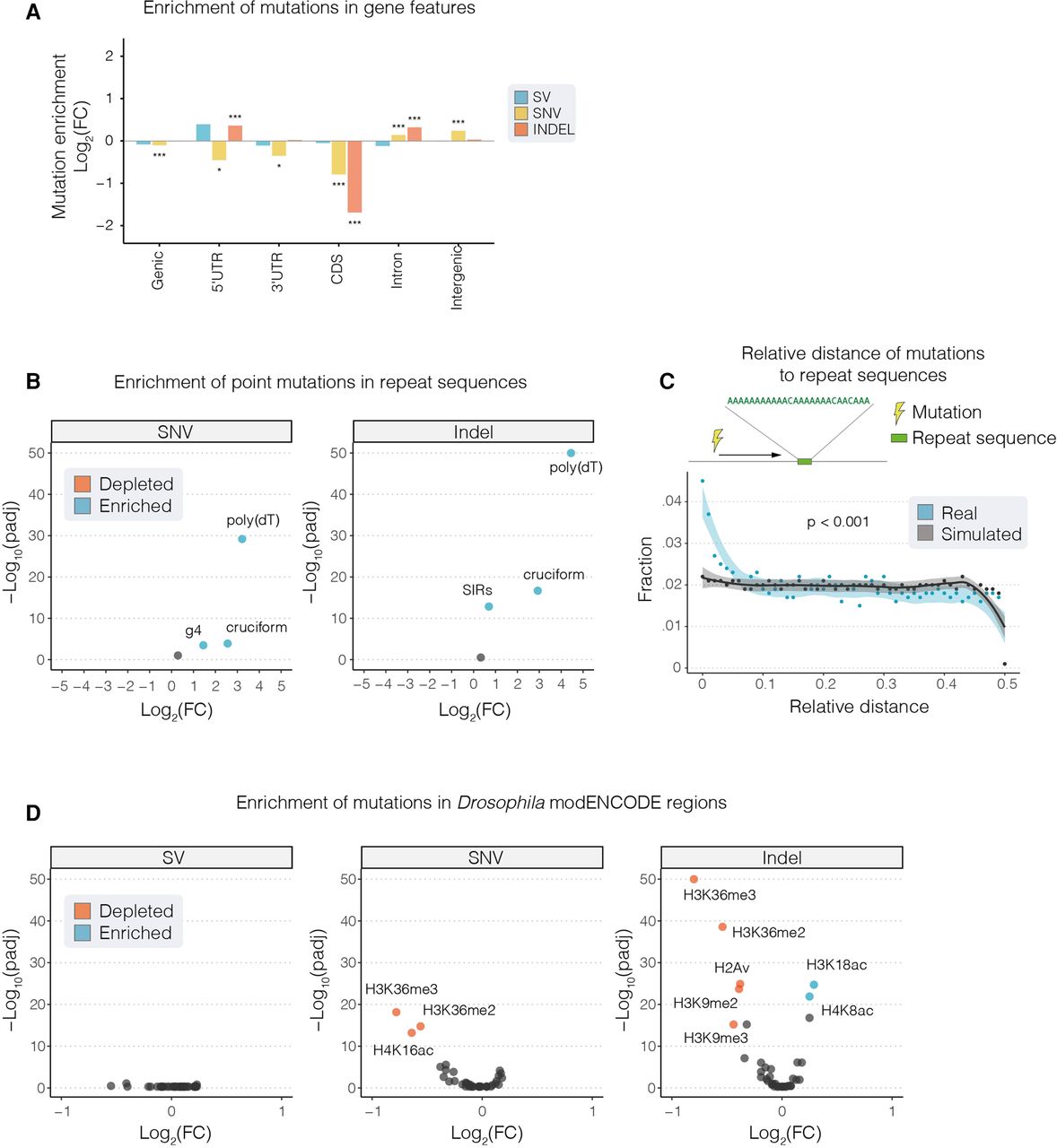 Distribution of somatic mutations in genome features. (A,B,D) The Log2 FC enrichment of mutations in genomic features. In each case, we compared the number of mutations in a given feature with the number expected given the feature's size. (A) Point mutations (SNVs and indels) were both strongly depleted in CDS regions. (B,D) Volcano plots showing enrichment or depletion of mutations in repeat regions (B) and chromatin features from the Drosophila modENCODE data set (D). Highlighted features represent those that with an E-score (−Log10(p) × Log2(FC); Methods) >5. (C) The distribution of relative distances between combined somatic mutations (breakpoints, SNVs, and indels; blue points) and the closest instance of repeat sequences in the genome. Simulated data are shown for comparison in gray. The y-axis of B and D are restricted to a maximum −Log10(padj) value of 50. Asterisks denote significance: (***) P < 0.001, (*) P < 0.5. All P-values shown have been generated from a two-sided binomial test and adjusted for multiple comparisons using a Benjamini–Hochberg adjustment.