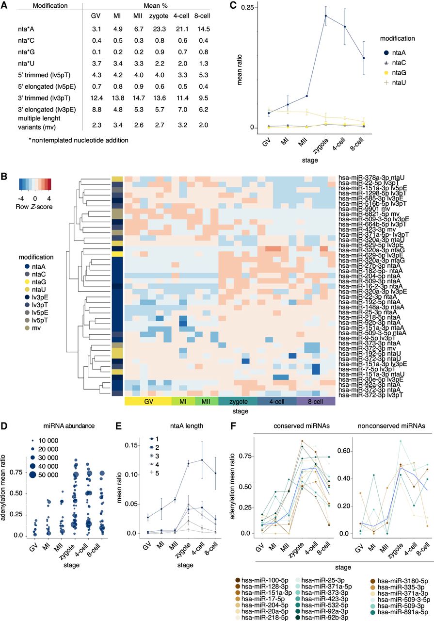 Dynamic miRNA 3′ tailing in human oocytes and early embryos. (A) miRNA modification mean proportions in different developmental stages. (B) Heatmap of DE (FDR < 0.05) miRNA modification isoforms (isomiRs) according to MACAU 2.0 (Sun et al. 2017). Euclidean distance and average linkage were used to cluster isomiRs (see A for nomenclature) by expression, presented as row Z-scores. (C) miRNA 3′ nontemplated nucleotide addition of A, C, G, and U in different developmental stages. miRNA 3′ adenylation (A-tailing) is frequent in zygotes and early embryos. (D) miRNA A-tailing ratio of 50 miRNA species (mean normalized reads greater than 500 in at least one stage). Size of the circle indicates the stagewise mean of the normalized miRNA abundance. (E) miRNA A-tailing modification length in different developmental stages. Modification lengths of up to 5 nt are shown. Addition of a single nucleotide was the predominant modification. (F) A-tailing dynamics of conserved and nonconserved miRNAs with highest A-tailing ratios (mean normalized reads greater than 1000 and mean ratio above 0.33 in at least one stage). Locally estimated scatterplot smoothing (loess) curve (blue) resembled the overall A-tailing modification trend. Mean stagewise miRNA modification ratio (C–F) and the 95% confidence interval (C,E,F) are shown.