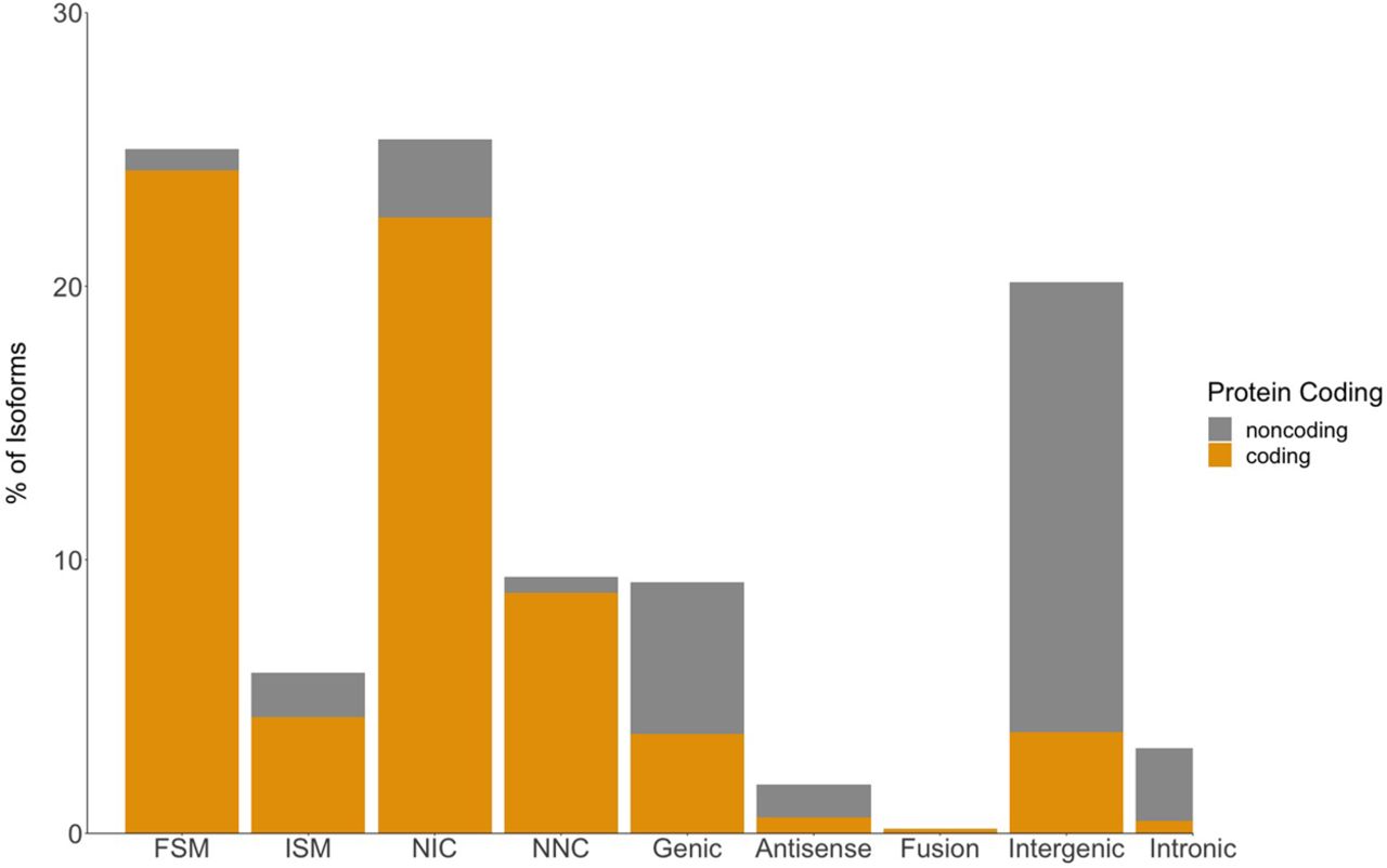In-depth characterization of isoforms by SQANTI for Iso-Seq transcriptome. Isoforms are classified into nine different splice categories by SQANTI: full-splice match (FSM), incomplete splice match (ISM), novel in catalog (NIC), novel not in catalog (NNC), genic, antisense, fusion, intergenic, and intronic. Each splice category is divided into predicted protein-coding isoforms (gold) and predicted non-protein-coding isoforms (gray).