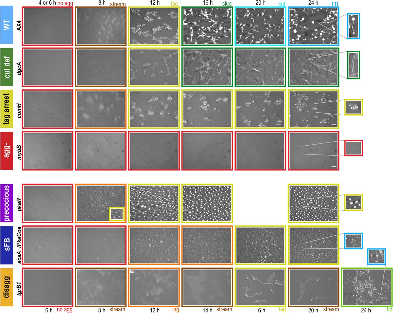 Developmental morphologies in different phenotype groups. Cells were starved and developed on black nitrocellulose filters. The phenotype groups and strain names are indicated on the left: wild type (WT, light blue), culmination defective (cul def, dark green), tight-aggregate arrest (tag arrest, dark yellow), aggregationless (agg-, red), precocious development (precocious, violet), small fruiting body (sFB,dark blue), and tight-aggregate/loose-aggregate disaggregation (disagg, orange). Developmental structures were photographed at the times (hours) indicated above the panels except for the disaggregation group in which times are indicated below. The frame colors indicate the most representative morphological stage: no aggregation (red), rippling/streams (brown), loose aggregate (orange), tight aggregate (dark yellow), tipped aggregate (light green), slug/first finger (dark green), culminant (cyan), and fruiting body (light blue). Bars = 0.5 mm. The most advanced developmental structures are shown in the twofold magnified images. Image brightness was adjusted according to the variable color of the nitrocellulose filters.