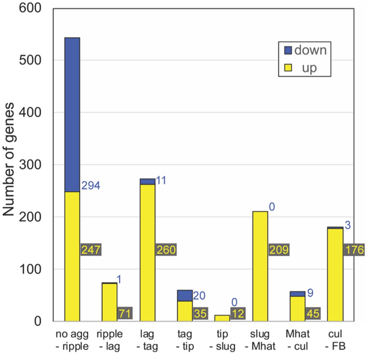 The number of milestone genes at each developmental transition. We performed differential expression analysis between samples across each developmental transition in AX4 (WT) development and selected transcripts that showed significant change at each transition. The graph shows the number of differentially expressed genes at each stage transition in AX4 (WT). Down-regulated genes (blue): mRNA abundance at the early stage is significantly greater than mRNA abundance at the later stage. Up-regulated genes (yellow): mRNA abundance at the early stage is significantly lower than mRNA abundance at the later stage. The stage transitions are indicated below each bar. Colored numbers beside the bars indicate the number of genes in each “down” and “up” category.