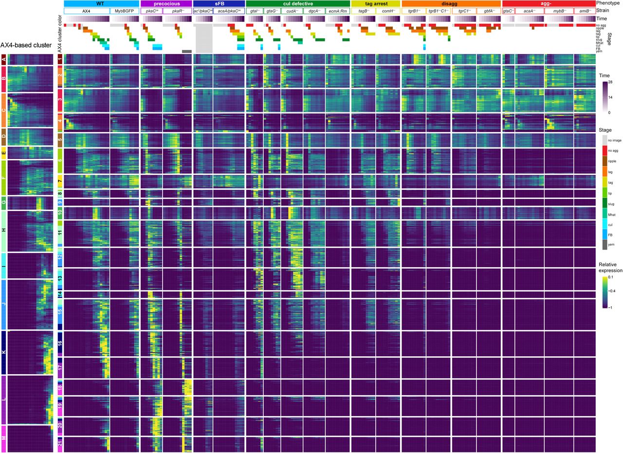 Developmental regulons are robust to temporal and genetic perturbations. We searched for genes whose expression patterns were similar despite changes in developmental time and strain genotype. The leftmost heatmap shows 13 clusters of genes that were coexpressed in the wild type AX4 during development. The clusters were assigned a letter (A–M) and a color as indicated on the left of the AX4-based column. We then reclustered these genes based on their expression patterns in all 21 strains. The resulting 21 regulons (numbered boxes with AX4-based assignment colors, left) are shown as heatmaps. Each row in the heatmaps represents a gene, each column represents a time point, and the entry colors represent relative mRNA abundances (as indicated in the relative expression scale on the right). Phenotype groups, strain names, developmental time (purple gradation, see scale on the right), and annotated morphological stages (see color legend on the right) are indicated above the heatmaps. The phenotype groups are WT (light blue), precocious development (precocious, violet), small fruiting body (sFB, dark blue), culmination defective (cul defective, dark green), tight-aggregate arrest (tag, dark yellow), tight-aggregate/loose-aggregate disaggregation (disagg, orange), and aggregationless (agg-, red). The morphological stages are no aggregation (no agg, red), rippling/stream (ripple, brown), loose aggregate (lag, orange), tight aggregate (tag, dark yellow), tipped aggregate (tip, light green), slug/first finger (slug, dark green), Mexican hat (Mhat, jade green), culmination (cul, cyan), FB (light blue), and yellow mound (yem, dark gray). Light gray indicates that no image was captured (no image, light gray).
