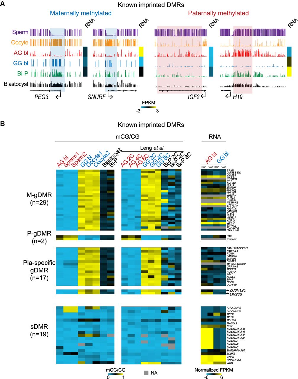 DNA methylation of known imprinted regions in the AG, GG, and Bi-P blastocysts. (A) UCSC snapshots showing the previously known DMRs located in PEG3, SNURF, IGF2, and H19. Our results showed that germline DMRs survived demethylation during early embryo development, indicating that our diploid AG and GG blastocysts are suitable models to screen for putative DMRs. The sperm and oocyte DNA methylation data are from Okae et al. (2014). (B) Heatmaps showing the DNA methylation levels of known imprinted DMRs and the related gene expression. DNA methylation in two-, four-, and eight-cell embryos published previously was included as a control (Leng et al. 2019). All replicates for the AG, GG, and Bi-P blastocysts were pooled. These known imprinted DMRs were clarified as previously reported (Okae et al. 2014). (Bi-P) Biparental embryo, (AG) androgenetic, (GG) gynogenetic.