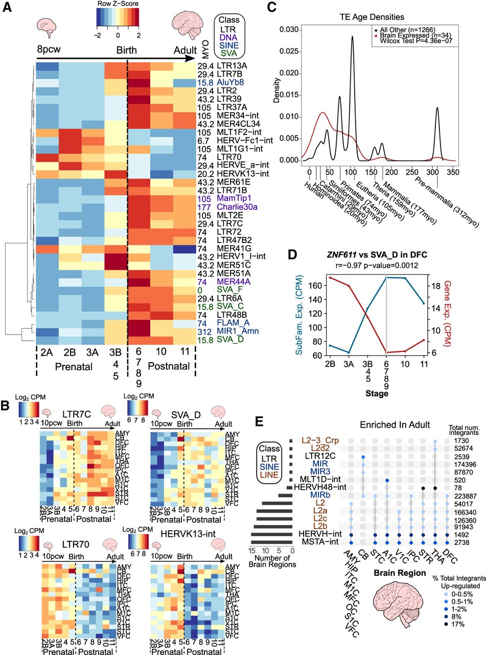 TE subfamilies and unique loci show spatiotemporal expression patterns. (A) Heatmap of TE subfamilies with concordant expression behaviors between both data sets (Pearson correlation coefficient ≥ 0.7) across human neurogenesis in the DFC. See also Supplemental Table S4. The mean expression values for stages 3B, 4, and 5 and for stages 6, 7, 8, and 9 were combined and averaged to reduce inherent variability owing to low numbers of samples for some stages (see Supplemental Fig. S1B). Scale represents the row Z-score. TE subfamily age in million years old (MYO) and class are shown to the right of the plot. (B) Heatmaps of TE subfamily expression across human neurogenesis in all 16 regions. See also Supplemental Tables S4 and S5. Scale represents log2 counts per million (CPM). Stage 2A was omitted owing to the lack of samples for some brain regions (see Supplemental Fig. S1B). (C) Density plot depicting estimated age of TEs in A (P ≤ 0.05, Wilcoxon test). Evolutionary stages and corresponding ages in MYO are shown beneath the plot. (D) Line plot showing expression in CPM of ZNF611 and its main TE target subfamily, SVA_D, and their Pearson correlation coefficient (−0.97, P-value = 0.0012). Gray line indicates birth at stage 6. (E) UpSet plot showing the significantly enriched differentially expressed subfamilies between adult and early prenatal stages per region from unique mapping analyses. Joined points represent combinations of significantly differentially expressed TE subfamilies. Points are colored with respect to the percentage of total integrants up-regulated. The total number of TE subfamily integrants in the genome is shown to the right of the plot. See also Supplemental Tables S6 and S7. All plots show expression data from BrainSpan.