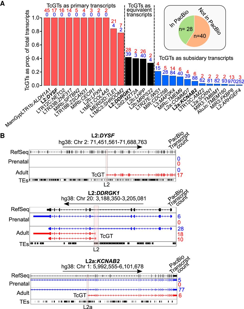 TcGTs are major contributors to neurodevelopmental transcript expression. (A, inset) Pie chart showing the number of TcGTs from Figure 4A detected with the same TE-derived TSS and isoform structure in PacBio long-read sequencing in the adult from Jeffries et al. (2020) in hg38. Bar charts show the proportion of total transcripts that are TcGT derived. Numbers above each bar represent the TcGT isoform PacBio transcript counts (red numbers) and annotated non-TcGT isoform PacBio transcript counts (blue numbers) in adult samples as determined by Jeffries et al. (2020). If some non-TcGT Ensembl-annotated isoforms had appreciably higher counts than others, only these were used. 5′-Truncated incomplete splice matches (as defined by Jeffries et al. 2020) for non-TcGTs were omitted unless similar in number to nontruncated transcripts. Red bars indicate the TcGT isoform is the primary transcript; black bars, TcGT isoforms have “equivalent” expression to canonical isoforms; and blue bars, TcGTs are subsidiary transcript isoforms. (B) Genome browser images of TcGTs (red) detected in long-read sequencing in prenatal and adult samples in hg38. Only the non-TcGT isoforms (blue) with the most PacBio transcript counts are shown for clarity. Vertical orange bars highlight the TE-derived TSS of the TcGTs and are the same as detected in our short-read RNA-seq analyses in hg19.