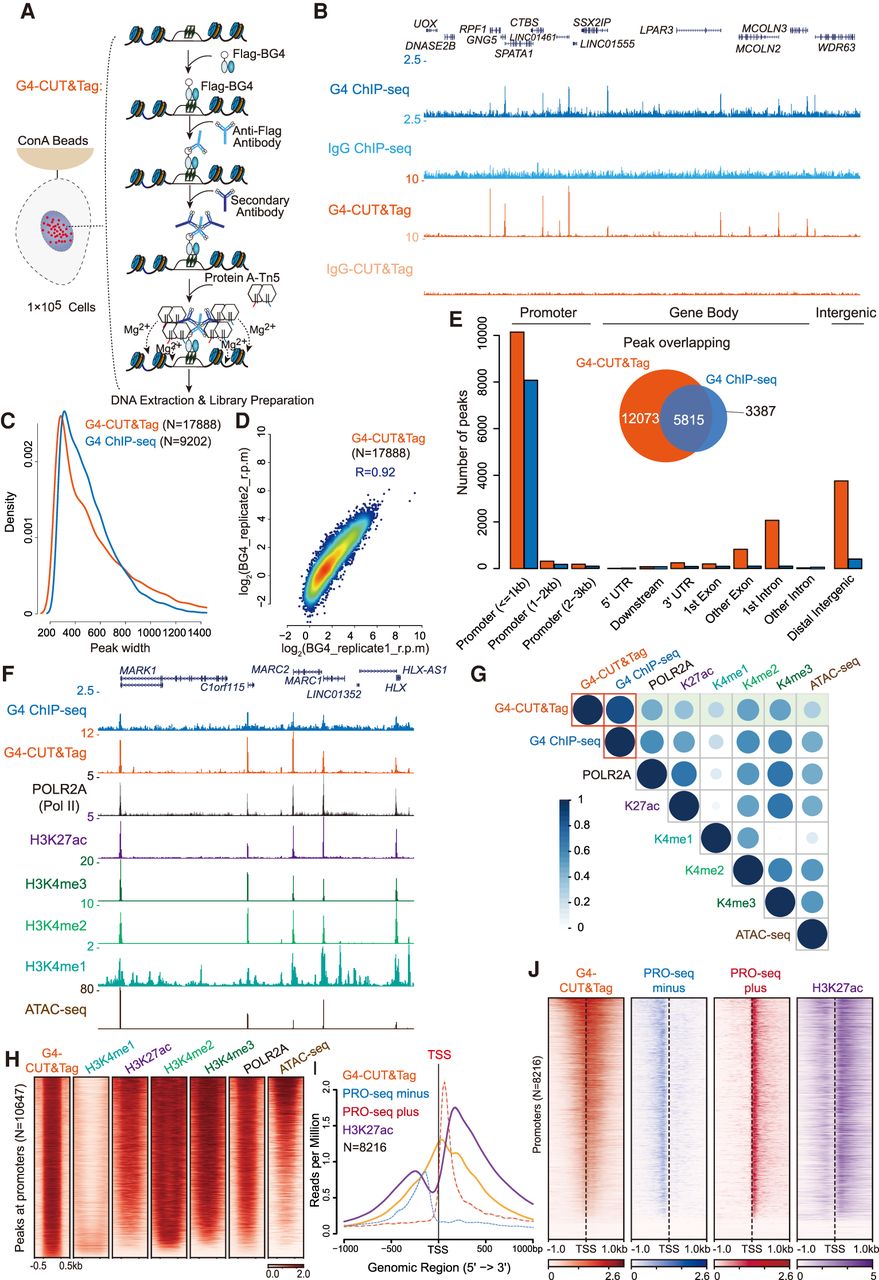 Comprehensive profiling of genome-wide native G4s by G4-CUT&Tag. (A) Schematic of G4-CUT&Tag with a G4-structure-specific single-chain antibody Flag-BG4. After binding of concanavalin A-coated magnetic beads to the cells and cell permeabilization, G4 structures were recognized by Flag-BG4 in situ. Anti-Flag antibody and secondary antibody were added sequentially to tether protein A-Tn5 transposase. Tn5 was activated by magnesium to cut the chromatin close to Flag-BG4 binding sites and simultaneously integrate adapters. After extraction, the Tn5-tagmented genomic DNA was amplified for library preparation and second-generation sequencing. For IgG control, mouse IgG was used to replace Flag-BG4 antibody. (B) UCSC Genome Browser tracks of G4 ChIP-seq and G4-CUT&Tag in HEK293T. The reads were aligned to human genome hg38 and normalized by reads per million. (C) Distributions of peak width of G4-CUT&Tag and G4 ChIP-seq. G4-CUT&Tag and G4 ChIP-seq peaks were called by MACS2 using corresponding IgG controls. A total of 17,888 G4-CUT&Tag peaks and 9202 G4 ChIP-seq peaks were identified. (D) Correlation plot between two G4-CUT&Tag biological replicates in HEK293T cells. (E) Genome-wide annotation of HEK293T G4-CUT&Tag and G4 ChIP-seq peaks. G4-CUT&Tag detected more G4s at the promoter, gene body, and intergenic regions than the G4 ChIP-seq method. (F) Tracks example of G4 ChIP-seq, G4-CUT&Tag, Pol II (subunit: POLR2A), H3K27ac, H3K4me3, H3K4me2, H3K4me1 ChIP-seq, and chromatin accessibility (ATAC-seq) in HEK293T, showing G4s mark transcriptional regulatory elements enriched with Pol II, multiple active chromatin marks, and open chromatin. (G) Correlation plot of G4s with POLR2A, histone modifications, and chromatin accessibility. Signals at the 17,888 G4-CUT&Tag peaks were counted and calculated by Pearson's correlation. (H) Heat map analysis of G4, histone modifications, POLR2A occupancy, and ATAC-seq signals at promoter regions in HEK293T. Heat maps were sorted by decreasing intensity of G4-CUT&Tag signals. (I,J) Metaplot and heat map of G4-CUT&Tag, PRO-seq, and H3K27ac signals at promoter regions. The TSSs are denoted by the vertical black-dashed lines.