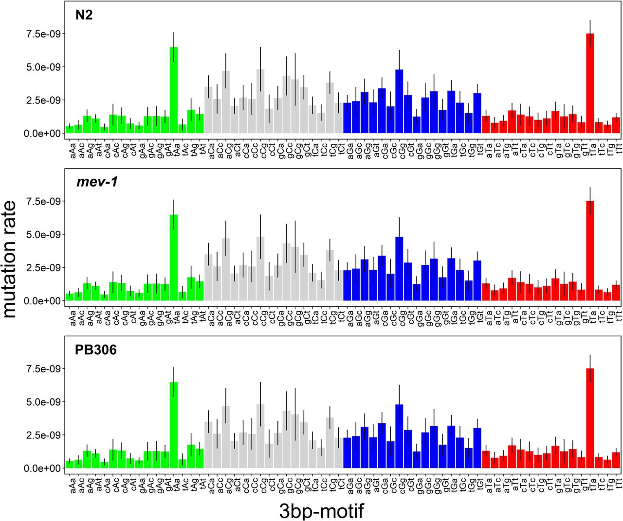 Sixty-four 3-bp motif base-substitution mutation rates. Motifs are arranged 5′-xYz-3′, with the mutant base Y in the middle position. Error bars, one SEM.