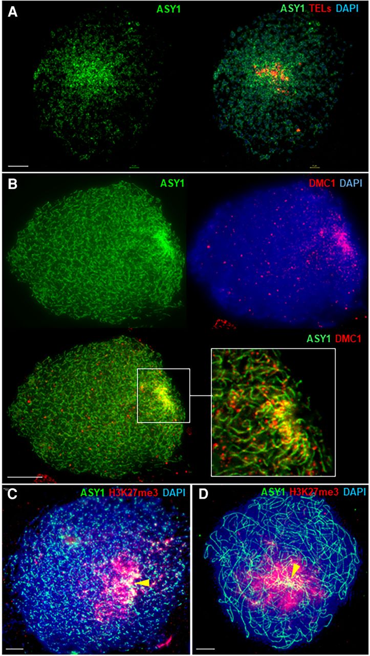 Immunolocalization of ASY1, DMC1, and H3K27me3 in pollen mother cells of wheat cultivar Cadenza during prophase I. (A) Immunolocalization of the axis protein ASY1 (green), combined with fluorescence in situ hybridization (FISH) of the telomeric repeat sequence (TELs, red) from Arabidopsis thaliana at the G2/leptotene transition. ASY1 signal is enriched in distal regions as the telomeres begin to cluster into a “bouquet” arrangement and the axis begins to linearize. (B) Leptotene-stage pollen mother cell immunostained for DMC1 foci (red) and co-immunostained for ASY1 (green), as axis linearization progresses through the nucleus. The zoomed detail of distal regions is from a single Z-frame (mid-nucleus) and shows individual DMC1 foci decorating the axis stained by ASY1. (C) Early-leptotene-stage pollen mother cell showing enrichment of H3K27me3 in distal regions, which are also marked by intense ASY1 immunostaining (yellow arrow). (D) H3K27me3 distal enrichment persists in early zygotene when chromosome axes are fully linear (yellow arrow). 4′,6-diamidino-2-phenylindole (DAPI) marks DNA. Scale bars = 10 µM. For clarity, some images are shown in several color combinations.
