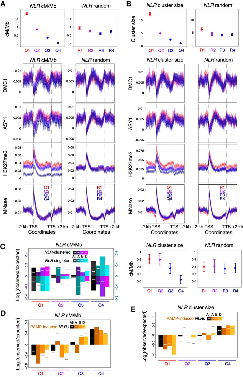 Chromatin, recombination, and clustering at nucleotide-binding and leucine-rich repeat (NLR) genes. (A) NLR genes were divided into four groups corresponding to those in the 100th–75th (Quantile 1), 75th–50th (Quantile 2), 50th–25th (Quantile 3), and 25th–0th (Quantile 4) percentiles with regard to their mean crossover rate (cM/Mb, derived from the Chinese Spring × Renan genetic map) between 1 kb upstream of transcriptional start sites and 1 kb downstream from transcriptional termination sites (Q1–Q4, left), or into four randomized groups (R1–R4, right). Solid circles denote the mean crossover rate for each group of genes (error bars = 95% confidence intervals for mean cM/Mb values). Metaprofiles show windowed mean values (solid lines) for each group of genes and 2-kb flanking regions (transparent ribbons = 95% confidence intervals). ChIP-seq coverage metaprofiles of DMC1, ASY1, and H3K27me3 (IWGSC 2018) are derived from log2(ChIP/input) profiles. (B) As in A, but with NLR genes divided into four groups according to decreasing physical cluster size (Q1–Q4, left), or into four randomized groups (R1–R4, right). Solid circles denote the mean cluster size (upper plots) or crossover rate (lower plots) for each group of genes (error bars = 95% confidence intervals for mean cluster size or cM/Mb values). (C) NLR gene quantiles defined by decreasing mean crossover rate (Q1–Q4 = high–low cM/Mb) were evaluated for representation of physically clustered or singleton NLR genes. Log2(observed/expected) ratios (bar graphs) and significance thresholds (horizontal gray lines, α = 0.05) were calculated by sampling from the hypergeometric distribution 100,000 times. Analyses were performed across all subgenomes and within each subgenome (All, A, B, and D). (D) As in C, but analyzing NLR gene quantiles defined by decreasing mean crossover rate for representation of NLR genes that were up-regulated upon challenge with pathogen-associated molecular patterns (PAMPs) (Steuernagel et al. 2020). (E) As in D, but analyzing NLR gene quantiles defined by decreasing physical cluster size.