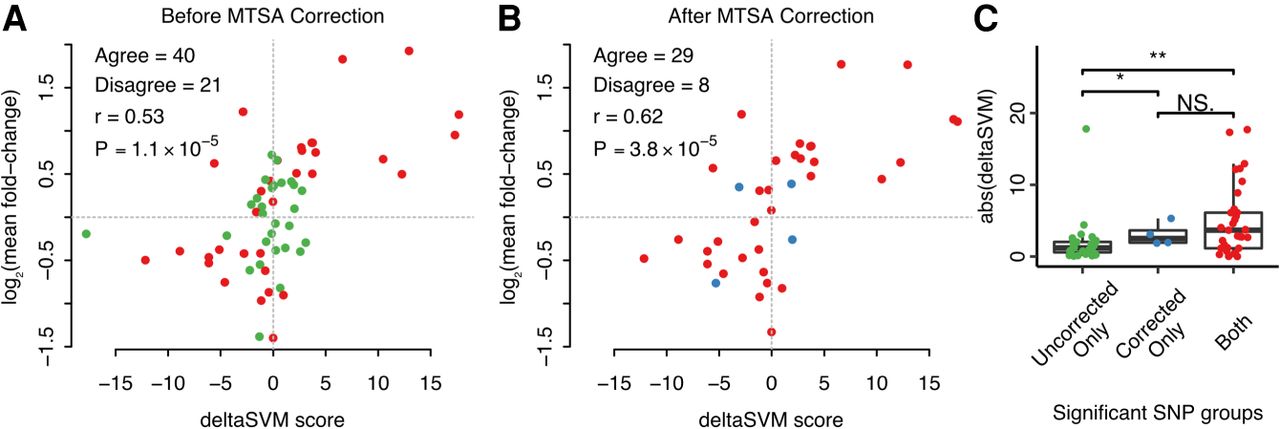 MTSA correction improves the identification of regulatory variants. (A,B) MTSA correction not only significantly reduces false positive identification but improves the correlation between deltaSVM and MPRA expression (from 0.53 to 0.62): log2 fold changes using raw expression (A) and MTSA-corrected expression (B) are compared to their deltaSVM scores. SNPs detected by both are highlighted in red. (C) Predicted impact on CRE activity by deltaSVM is compared by group: significant SNPs without MTSA correction only (green), significant SNPs with MTSA correction only (blue), significant SNPs both with and without MTSA correction (red). The significant SNPs after MTSA correction (blue and red) are more explainable by their sequence changes (i.e., larger absolute deltaSVM values). One-sided Mann–Whitney U test results are shown: (*) P < 0.05; (**) P < 0.005.