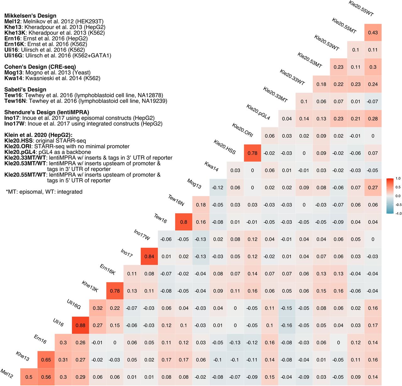 Pairwise Pearson's correlations between the 21 data sets using trained 8-mer SVR weights. Differences in the MPRA designs and cell types are major determining factors of the tag sequence effects. Pearson correlation coefficients are shown in the matrix.