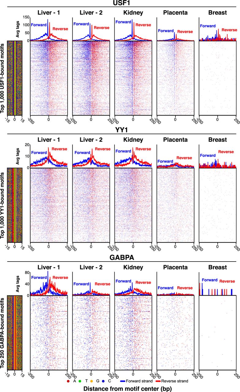 Application of ChIP-exo in human tissue using PCRP mAbs. ChIP-exo heatmap, composite, and DNA sequence four-color plots are shown for the indicated number and type of bound motifs for the indicated targets, in the indicated organ types (the liver includes two donors). The 5′ end of aligned sequence reads for each set of experiments was plotted against the distance from the cognate motif, present in the union of all called peaks between the data sets for each indicated target. Reads are strand-separated (blue, motif strand; red, opposite strand) and total-tag-normalized across samples. Rows are linked across samples and sorted based on their combined average in a 100-bp bin around each motif midpoint.