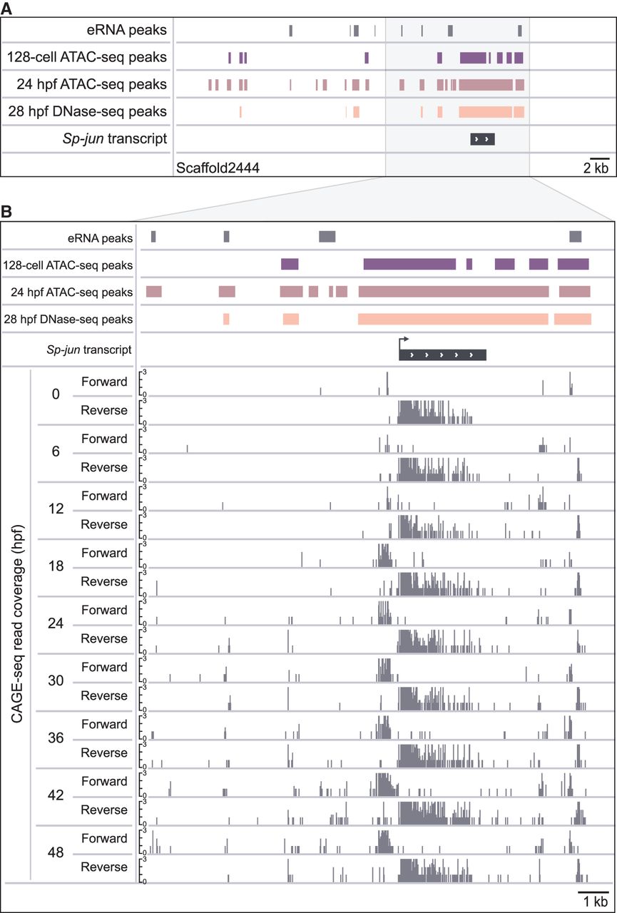Examples of eRNA peaks near Sp-jun. (A) Three of the four eRNA peaks shown (top track; gray bars) overlap with chromatin regions that are hyperaccessible at 24 hpf but not at the 128-cell stage, as determined by ATAC-seq and DNase-seq (Shashikant et al. 2018). (B) Temporal CAGE-seq coverage tracks illustrate the bidirectional expression of eRNAs and the very low abundance of eRNA reads relative to coding genes (scale: zero to three read counts). Sea urchin jun is expressed at high levels maternally, followed by a second peak of expression at gastrula stage. Spatially, jun is distributed homogenously in unfertilized egg and during early cleavages and is restricted to the PMCs at later stages (Russo et al. 2014).
