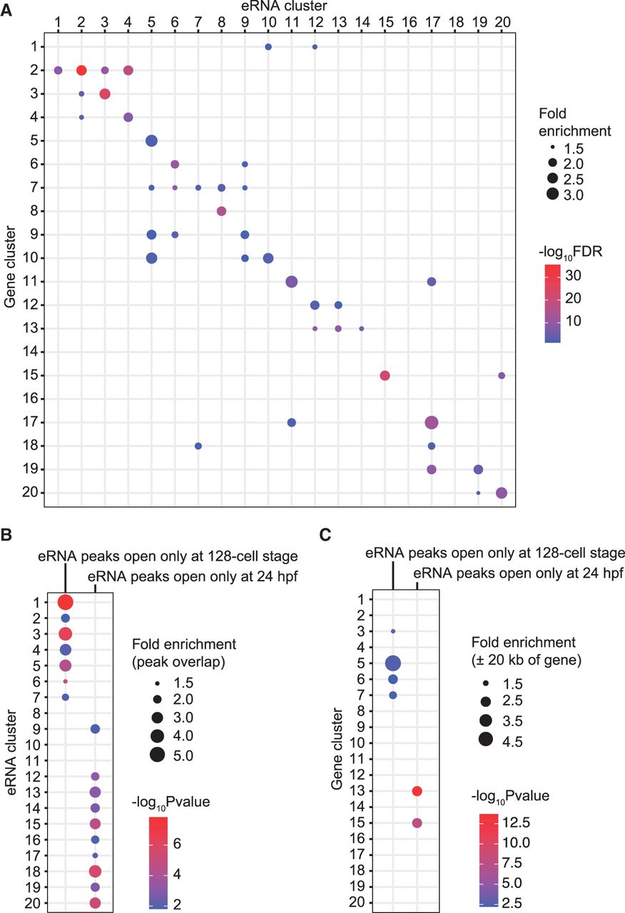 Expression pattern correlation analysis of eRNAs and nearby genes (cluster analysis summarized in Supplemental Fig. S6). (A) Fold enrichment of clustered eRNAs within 20 kb of genes in “parental” or other clusters (compared with total eRNAs in this analysis) is represented by the circles, and the color of the circles correspond to the significance of the enrichment, expressed as −log10(FDR). Only cluster pairs that show greater than 1.5-fold enrichment and FDR < 0.05 are shown. (B) Analysis of eRNA peaks that are exclusively accessible at the 128-cell stage (128-cell eRNAs) or 24 hpf (24 hpf eRNAs) to overlap with eRNA peaks from different temporal expression clusters. (C) Analysis of eRNA peaks that are exclusively accessible at the 128-cell stage or 24 hpf to be within 20 kb of clustered genes. Fold enrichment is represented by the size of the circles, and the colors correspond to the significance of the enrichment, expressed as −log10(P-value). Only enrichments that show greater than 1.5-fold enrichment and P < 0.05 are shown.